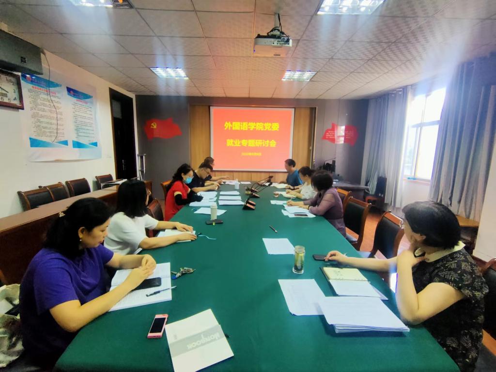本网讯(通讯员/王硕)为积极应对当前就业形势变化,全面落实“稳就业”“保就业”决策部署,8月6日,外国语学院党委于1号教学楼234室组织召开就业专题研讨会,会议由学院党委书记赵万哲主持,学院领导班子及相关负责人参加。