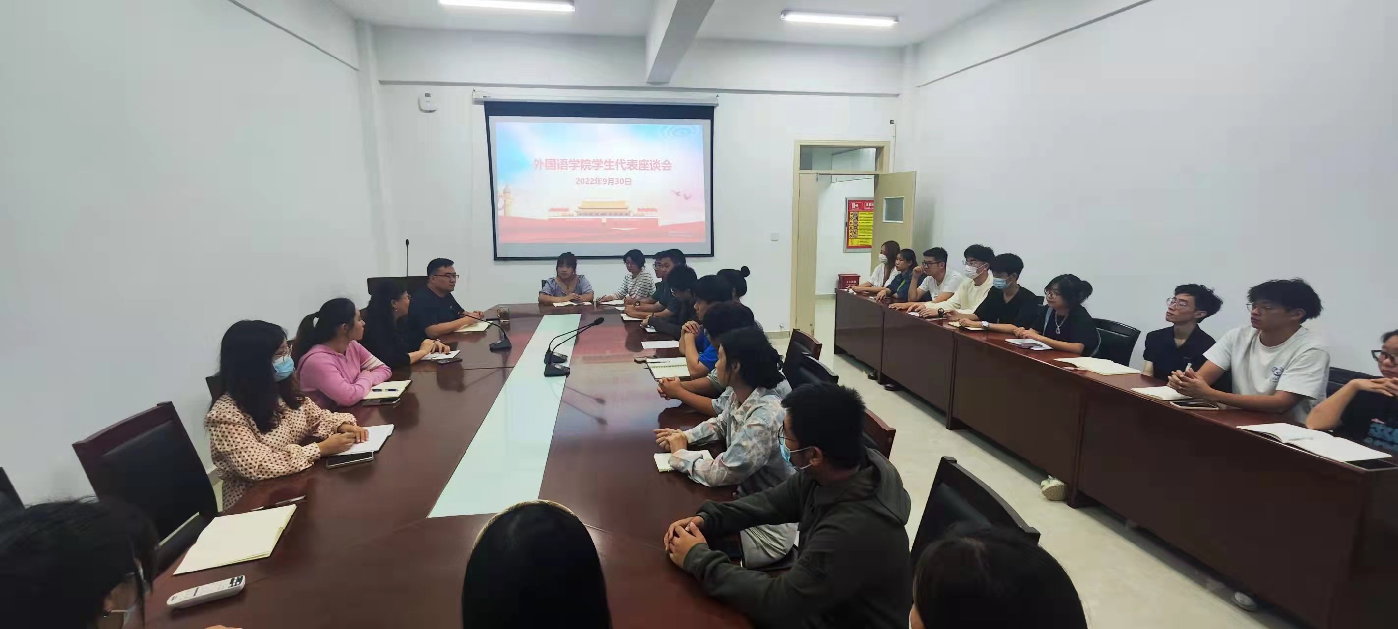 本网讯(通讯员/吴雨晴)9月30日,外国语学院于19教201室召开学生代表座谈会。本次活动由外国语学院团学办副主任孙健主持,外国语学院党委书记赵万哲及全体辅导员出席,学生代表积极参加。
