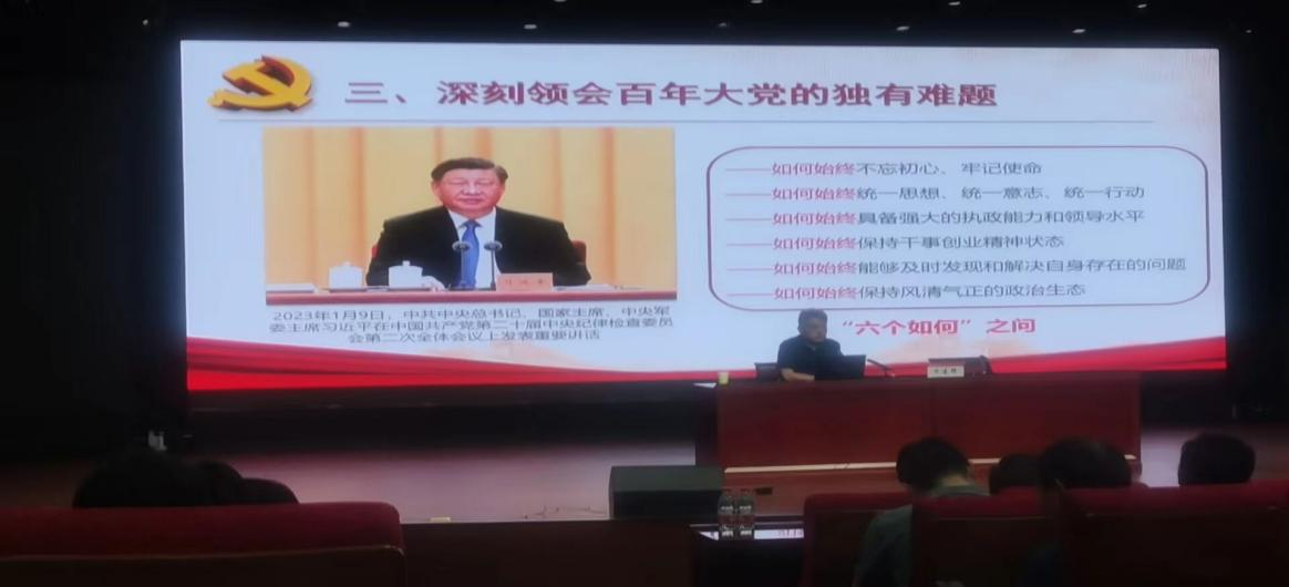 讲座伊始,许建辉首先提到革别人命容易,革自己命难,然后讲述在党的历史上每一次大的革命,都是在最危急的关头,最危险的时刻挽救党、挽救革命、挽救中国的伟大壮举。接下来着重阐述深刻领会百年大党的独有难题,以习近平总书记“六个如何”的讲话为切入口,向与会教师展示应该如何始终“不忘初心、牢记使命”;如何始终统一思想、统一意志、统一行动;如何始终能够及时发现和解决自身存在的问题等等。最后再激励广大党员干部学史明理、学史增信、学史崇德、学史力行,扎实落实“再学习、再调研、再落实”,深刻体会马克思主义的指导作用,勉励师生站在“两个一百年”奋斗目标历史交汇点上,不忘初心,肩负起民族复兴的历史重任。