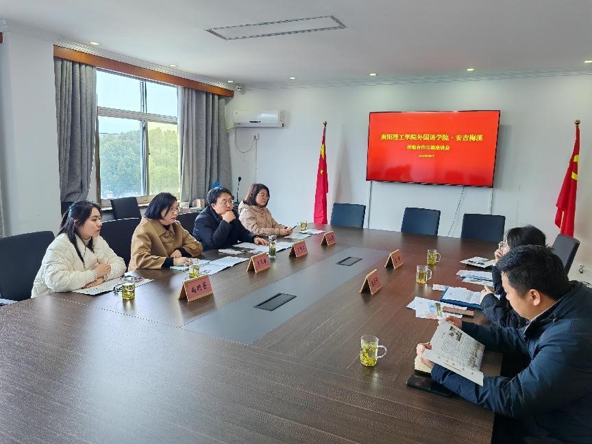 此外,外国语学院联合梅溪镇政府召开“南阳理工学院外国语学院-梅溪镇校地合作交流座谈会”。座谈会上,李爽正介绍校情与外国语学院学生培养情况,安吉县公共就业和人才服务中心副主任徐歆龙介绍安吉县情及大学生就业创业政策,梅溪镇党委委员范晨恩介绍梅溪镇基本情况及大学生招引情况。