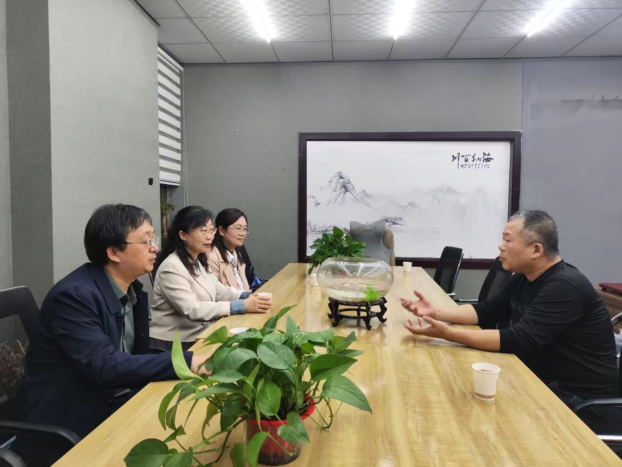 随后,双方就电商市场的蓬勃发展及前景进行了座谈交流。耿峥嵘详细介绍了玉器电商直播的运营模式、市场需求及人才结构,表示随着电商行业的不断壮大,对于具备专业素养和电商技能的人才需求日益迫切。赵万哲就学院的教学、学生能力培养与职业规划进行了介绍,强调了外语专业学生在语言沟通、文化理解方面的天然优势,这些优势在跨境直播电商中能够发挥巨大作用。