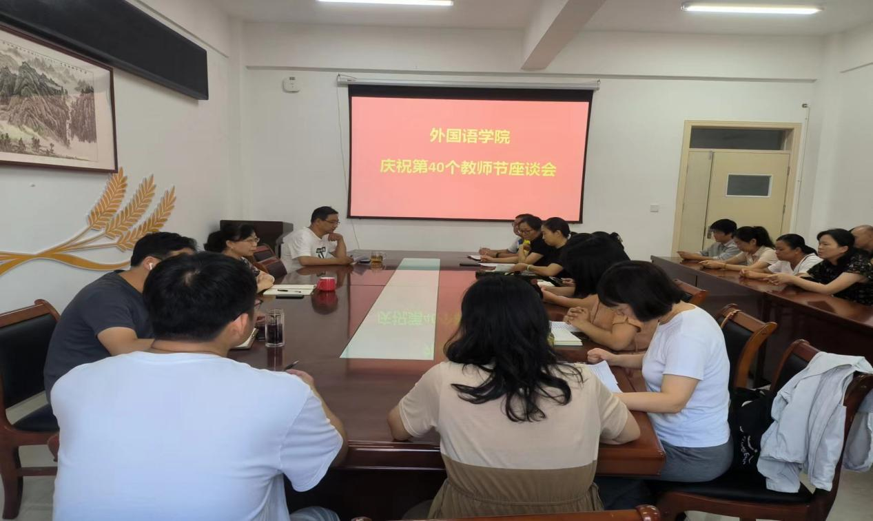 本网讯(通讯员/赵慧)第40个教师节来临前,外国语学院于9月9日成功举办了一场以“大力弘扬教育家精神,加快建设教育强国”为主题的庆祝教师节座谈会。本次活动旨在深入学习贯彻党的二十大及二十届二中、三中全会精神,进一步激发教师们的使命感与责任感,推动学院教育教学工作再上新台阶。外国语学院领导班子和教师代表参加本次座谈。