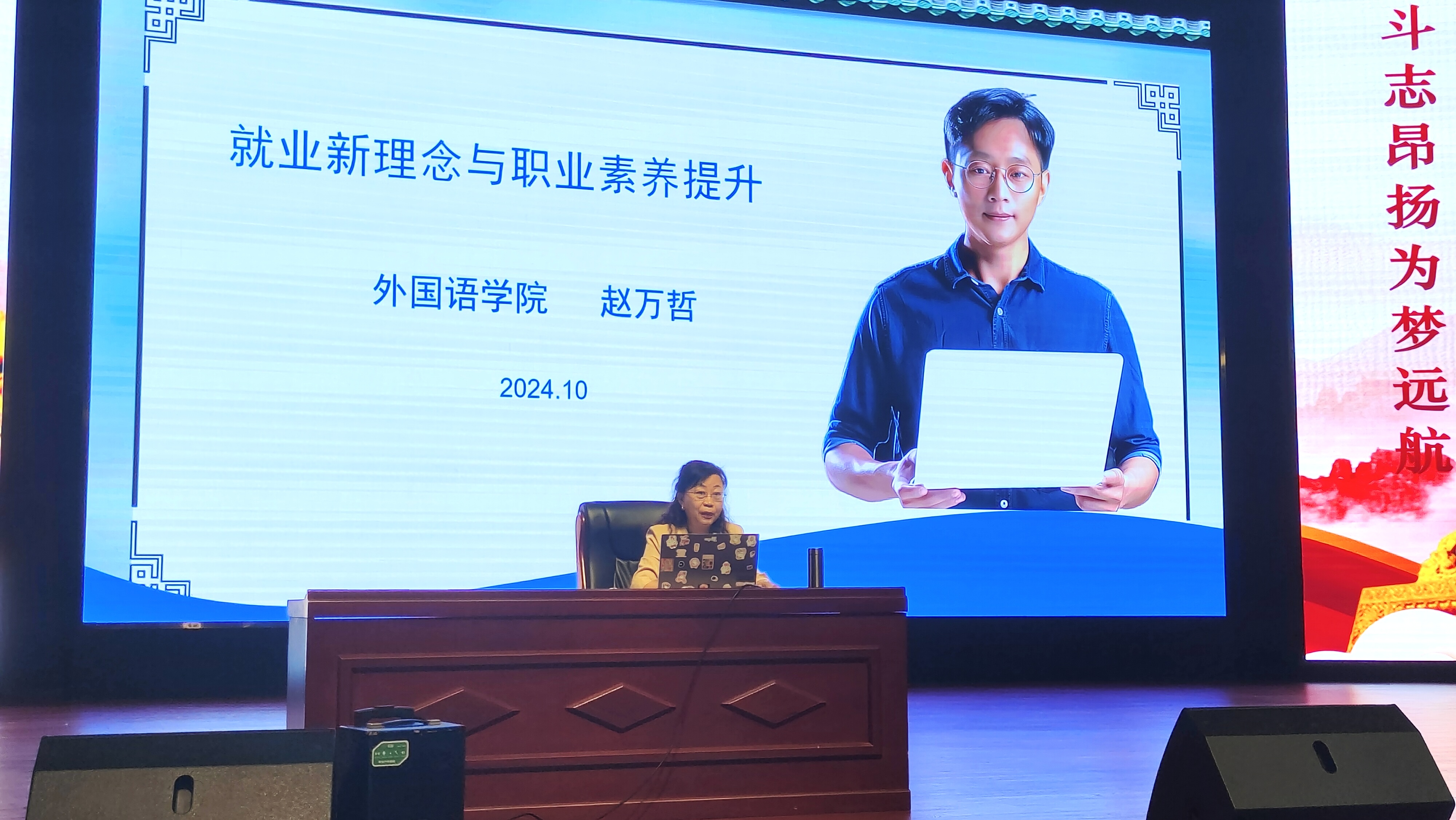 本网讯(通讯员/韩琳娜)为了帮助外国语学院学生更好地应对未来的就业问题,提高学生就业相关知识水平。10月9日,外国语学院于外国语学院东校区演播厅举办“就业新理念与职业素养提升”主题讲座。本次讲座由外国语学院赵万哲院长主讲。