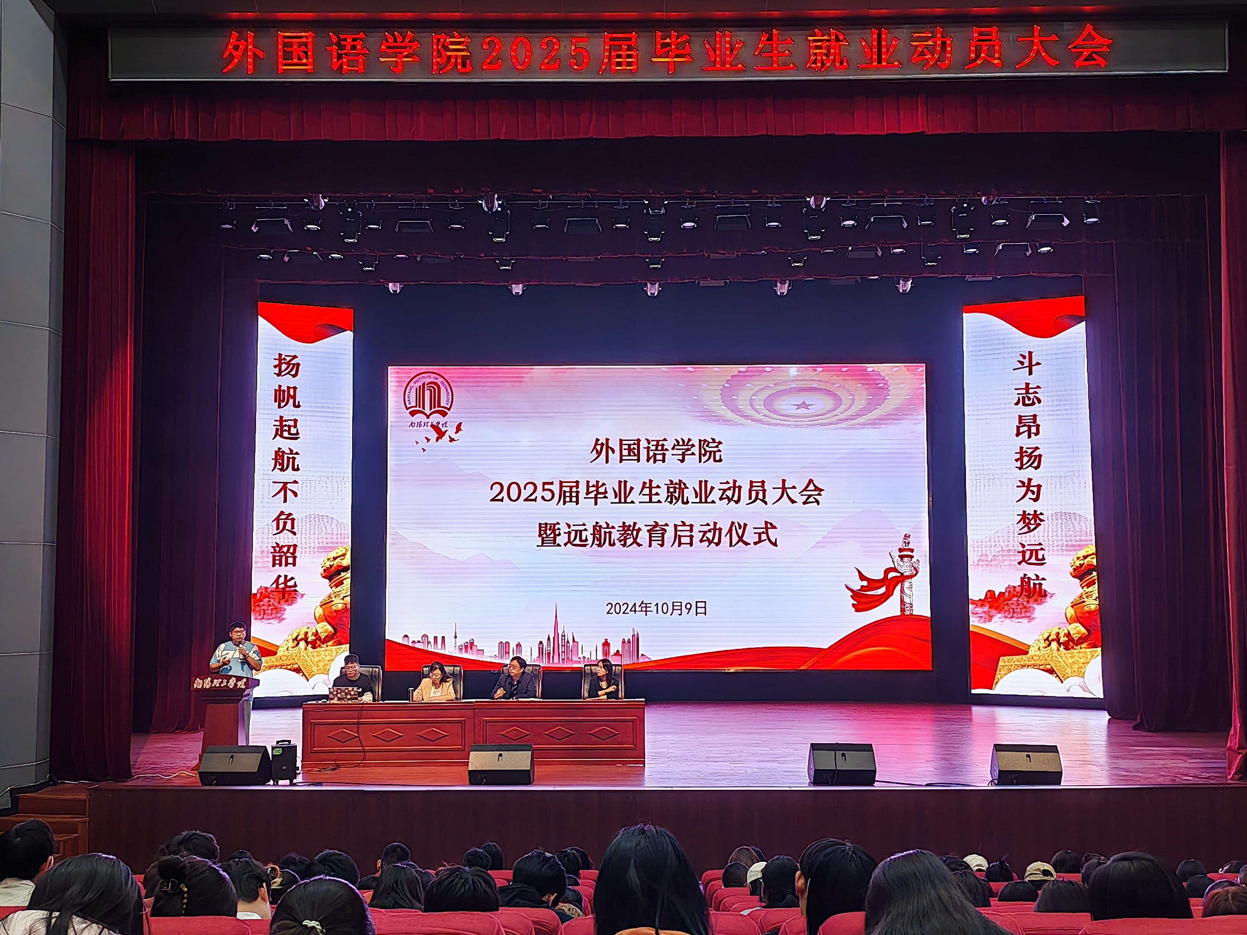 本网讯(通讯员/肖婧宜)为帮助2025届毕业生顺利就业,鼓励学生们积极应对就业问题,10月9日,外国语学院于东校区音乐厅举办了2025届毕业生就业动员大会。本次大会由外国语学院院长赵万哲主讲,党委副书记李爽正主持,就业专干李鹏飞、21级辅导员尚明萱参加。