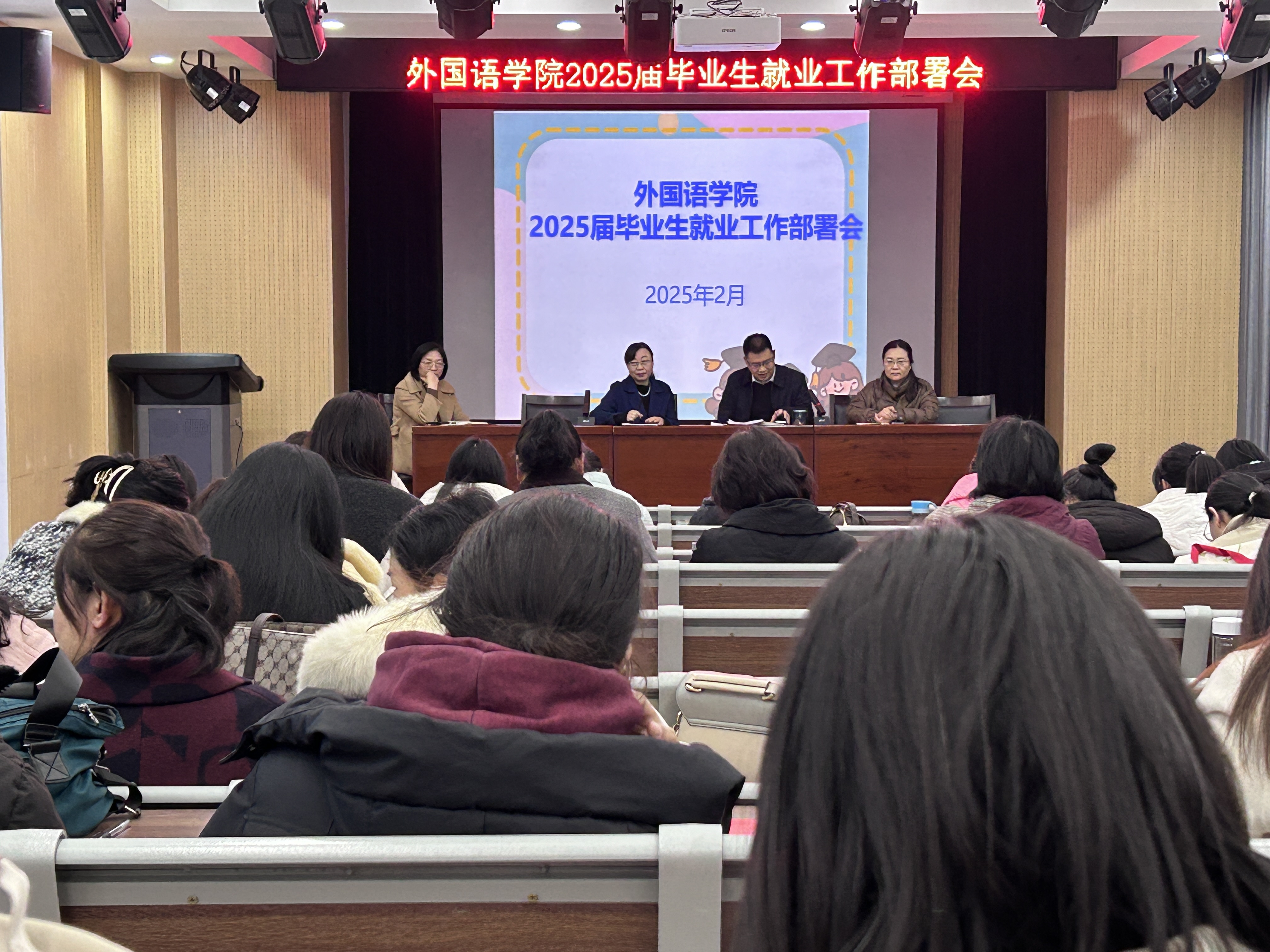 本网讯(通讯员/甄佳)为进一步推动就业工作,提升毕业生就业质量,2月25日,外国语学院于19号教学楼105室召开就业工作部署会,院长赵万哲、党委书记李新宁、副院长李秋芳、包相玲出席会议,就业专干李鹏飞和全体就业指导教师参加。