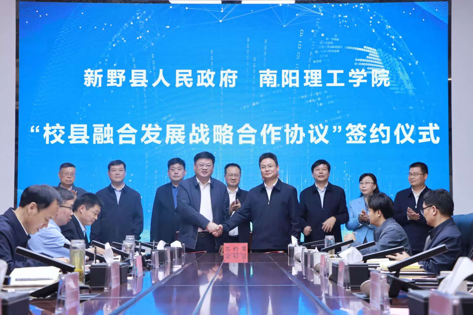 签约仪式上,郝好山、李文鹏代表校县双方签署“校县融合发展战略合作协议”;双方就“共建新野县科技创新服务中心”、“药材产地溯源及重茬土壤改良”、“集成电路制造PCB电子线路板高精度成孔关键技术”等项目签订了合作协议;南阳理工学院并为新野旭润光电科技公司、南阳鼎泰高科公司、召父农业科技开发公司、新正方电子科技公司四家公司授牌。