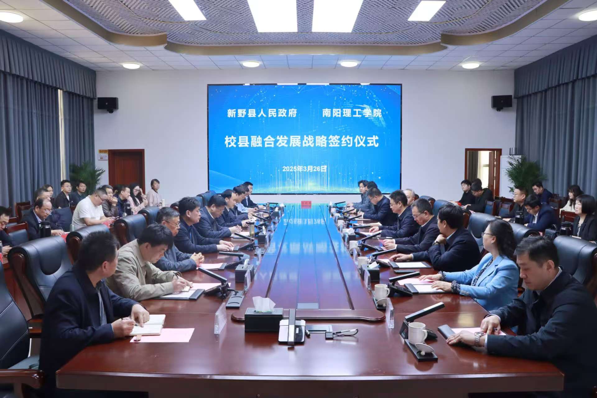 本网讯(特约记者/滕冰冰)2025年3月26日上午,外国语学院院长赵万哲、党委书记李新宁陪同校长郝好山、副校长蔡广宇、校地合作管理与服务中心主任赵彦普、校地合作处副处长韩峰、南阳市科技局副局长王成晓等一行,赴新野县人民政府参加“校县融合发展战略协议”签约仪式。
