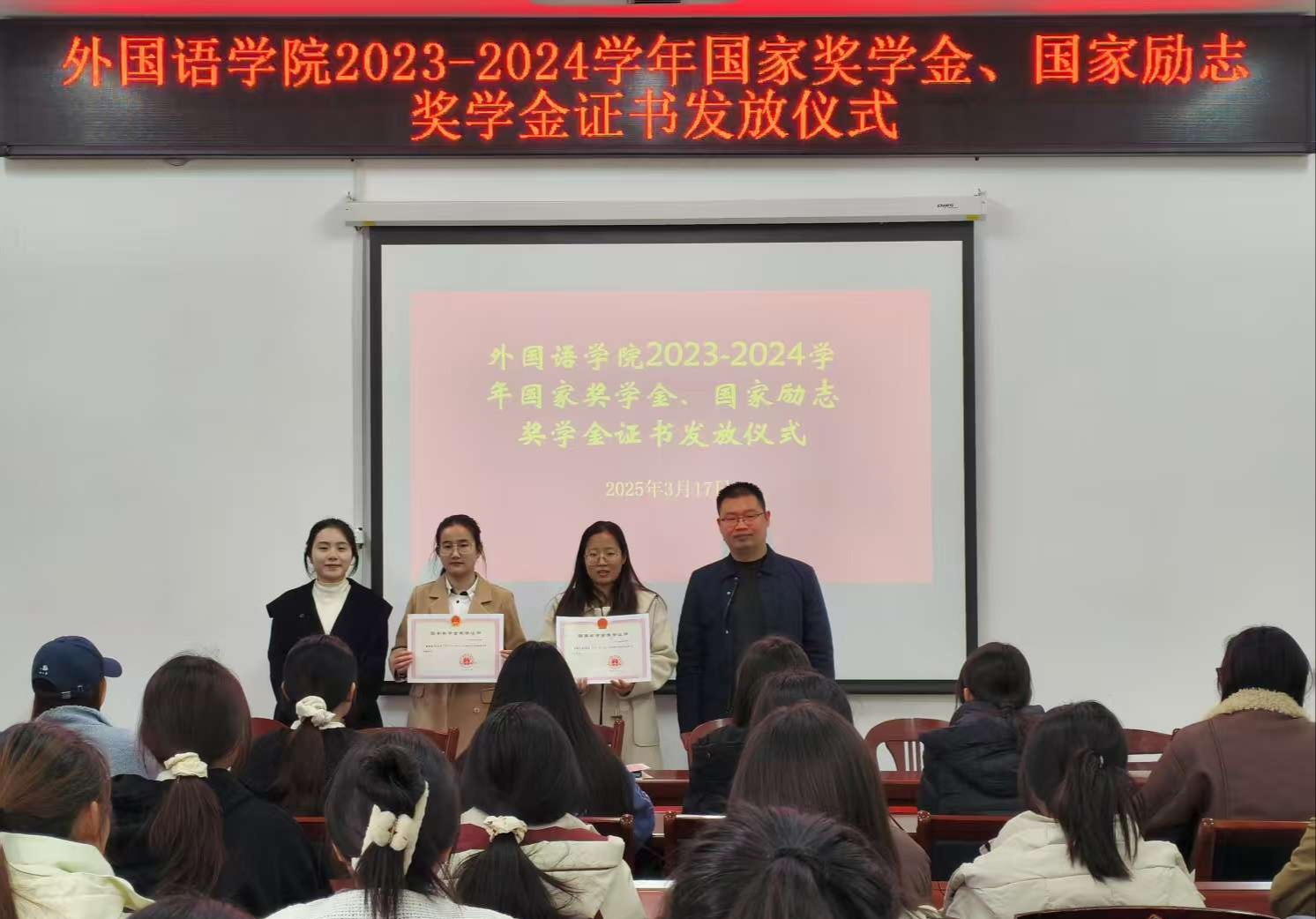 本网讯(通讯员/杨雅晴)为表彰先进,树立典型,3月17日下午,外国语学院于19教202会议室举办2023-2024学年国家奖学金、国家励志奖学金证书颁发仪式,外国语学院党委书记李新宁出席,资助专干尚明萱主持会议,国家奖学金和国家励志奖学金获得者参加。