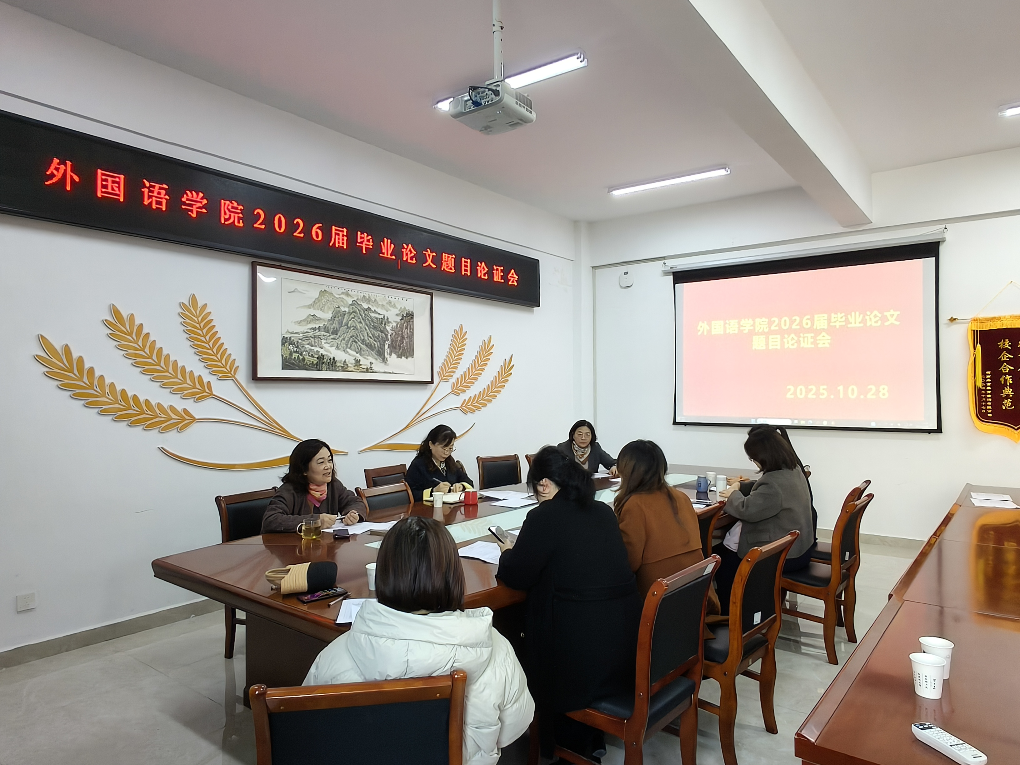 本网讯(特约记者 李康)10月28日下午,外国语学院组织召开2026届本科毕业论文题目论证会,院长赵万哲主持会议,学院教学委员会围绕论文选题的科学性、可行性及创新性展开深入研讨,旨在提升毕业论文质量。