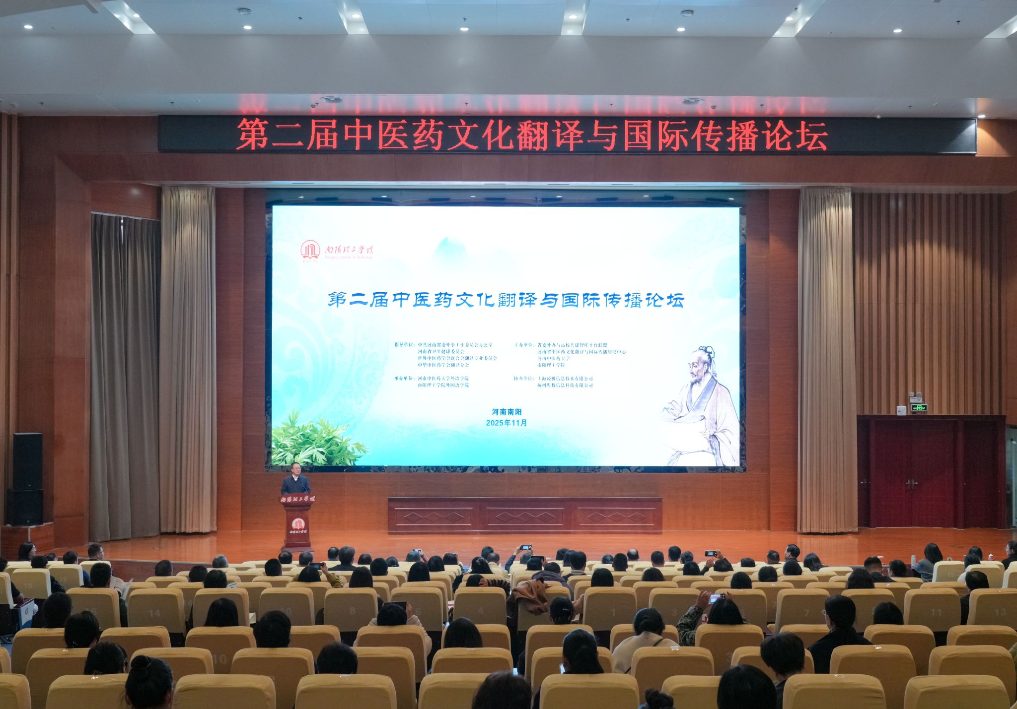 本网讯(特约记者/王玥晴)2025年11月14日至16日,第二届中医药文化翻译与国际传播论坛在南阳理工学院顺利举行。本届论坛以“中医药文化精准翻译与有效传播”为主题,由河南省委外办与高校共建智库平台联盟、河南省中医药文化翻译与国际传播研究中心、河南中医药大学和南阳理工学院共同主办。