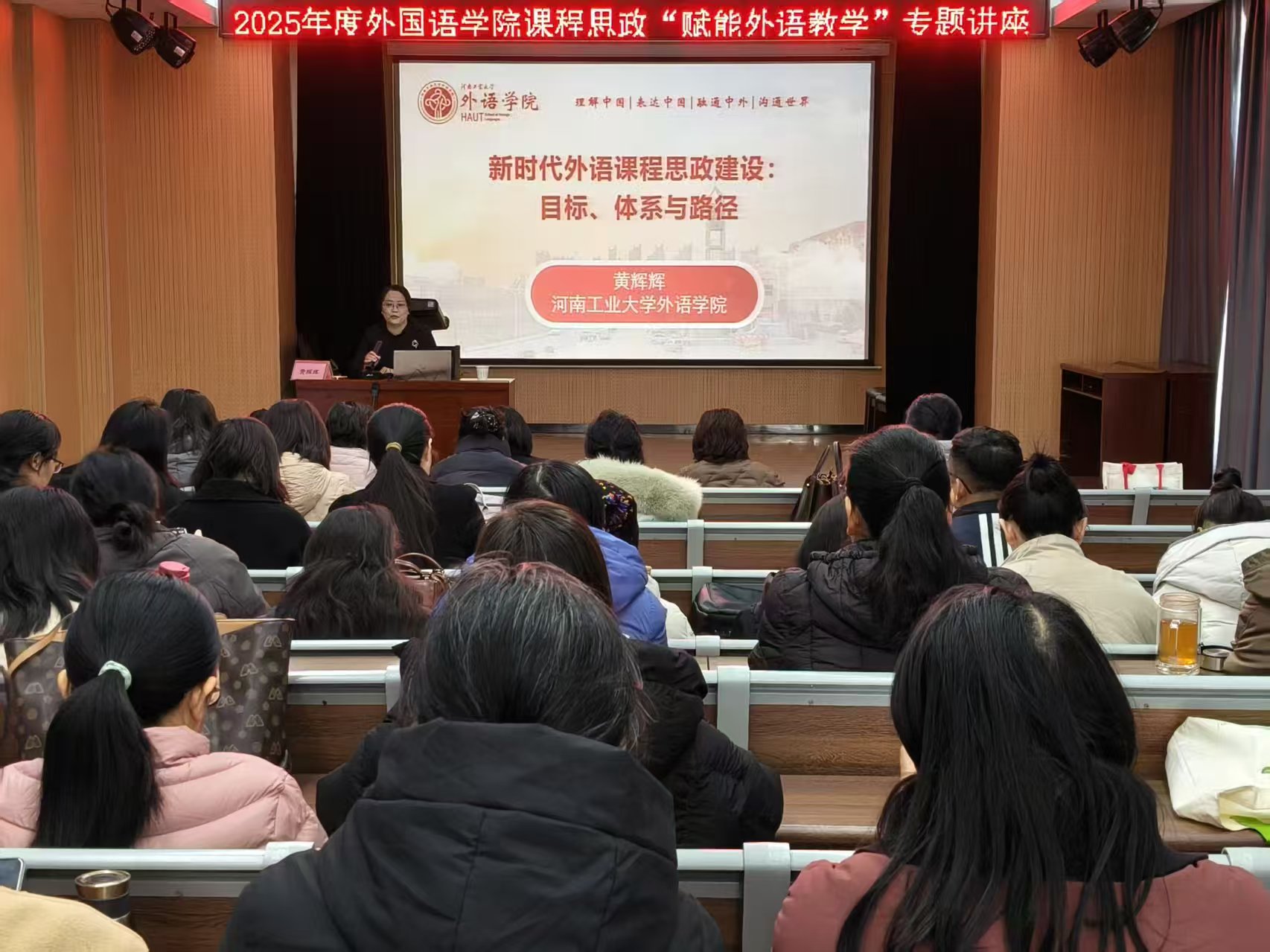 本网讯(特约记者/宁会勤)12 月 2 日下午,外国语学院在 19105 教室举办 2025 年度课程思政 “赋能外语教学” 专题讲座。讲座由外国语学院院长赵万哲主持,学院全体教师参会,河南工业大学外语学院院长黄辉辉教授受邀担任主讲人。