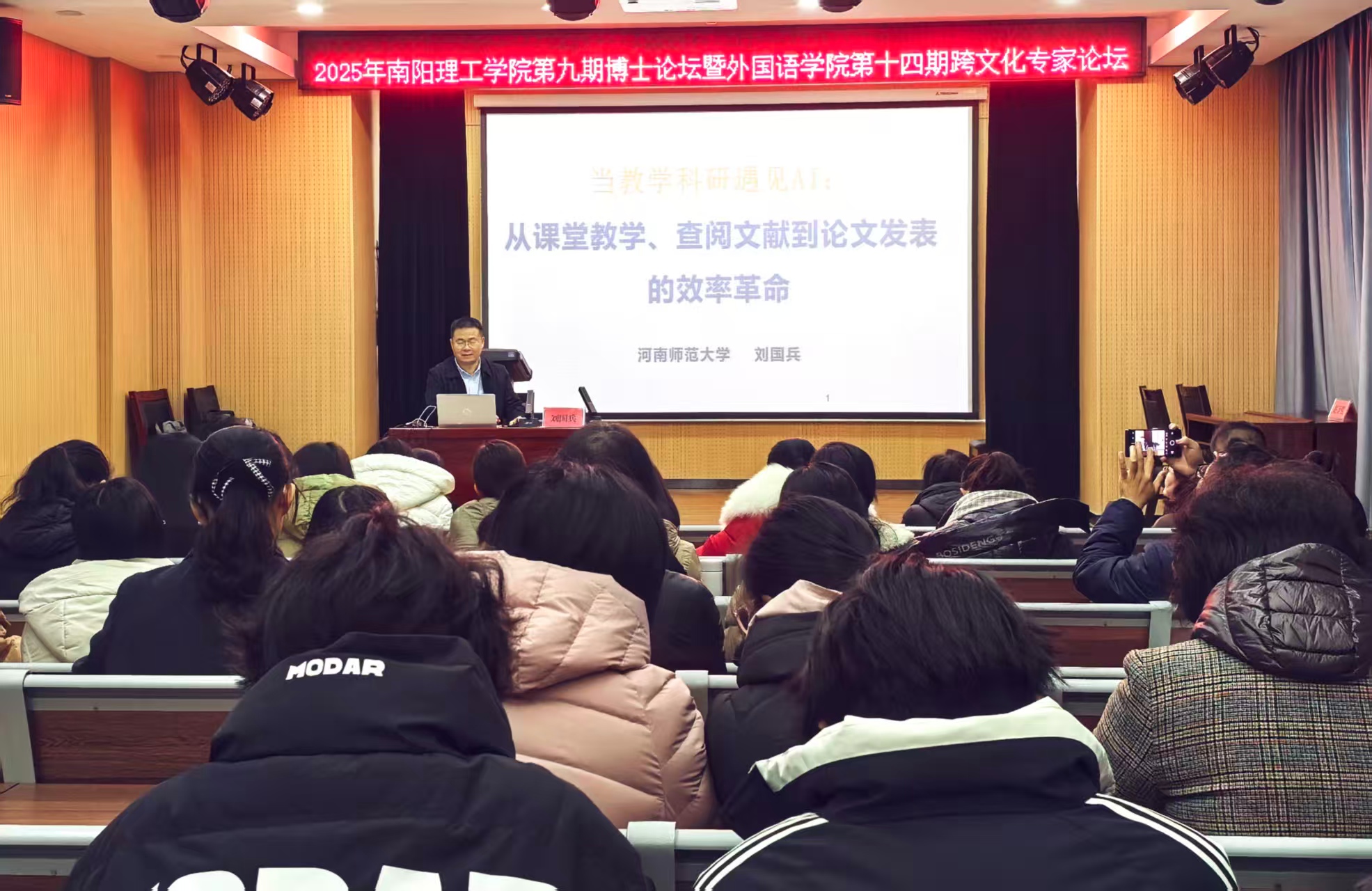 本网讯(通讯员/滕冰冰)12月12日,南阳理工学院第九期博士论坛在外国语学院成功举办。本次论坛由我校科研管理处主办,外国语学院承办。论坛以“人工智能如何赋能外语教师成长”“区域国别学视域下的澳大利亚研究:入门分享与探索交流”为题目展开,与外国语学院第十四期“跨文化研究专家讲座”合并进行。论坛由外国语学院副院长包相玲主持。