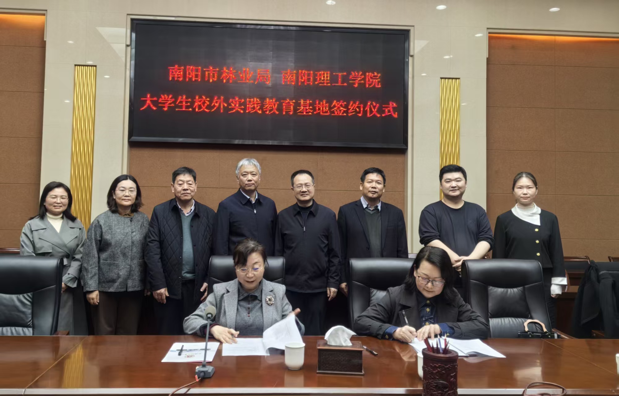 本网讯(通讯员/王玥晴)为落实产教融合,2026年3月25日,南阳理工学院与南阳市林业局共建大学生校外实践教育基地签约揭牌仪式在南阳理工学院会议中心隆重举行。南阳理工学院副校长蔡广宇、南阳市政府副秘书长唐荣涛、市林业局长李笑非等领导,以及外国语学院院长赵万哲等共同出席仪式。