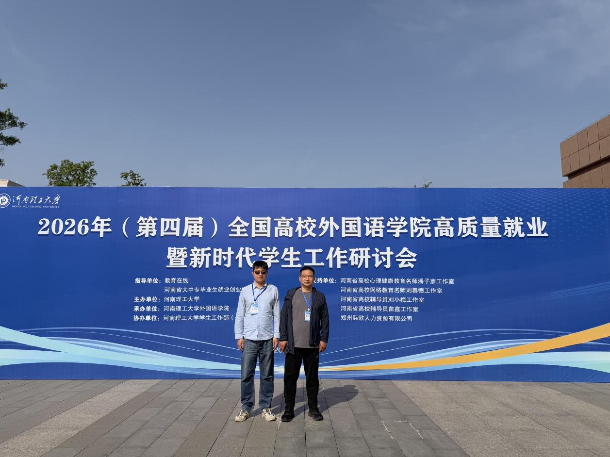 本网讯(通讯员/曾佳音)4月25日至4月27日,2026年(第四届)全国高校外国语学院高质量就业暨新时代学生工作研讨会在河南理工大学举行,外国语学院作为“河南省高校外语类院系就业育人共同体联盟”成员参加研讨会。