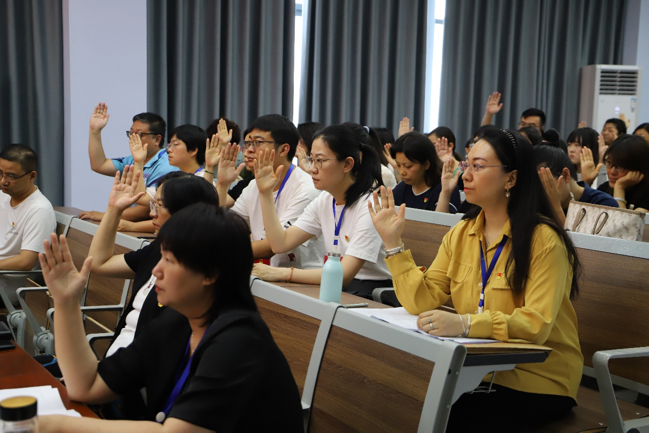 大会开始,全体党员起立,奏唱国歌。大会进行第一个阶段,李书记宣读代表候选人预备人选名单,后经举手表决后一致通过。大会进行第二个阶段。首先,大会通过了《代表选举办法(草案)》和计票人、监票人名单,接着在充分发扬民主的基础上,以无记名投票差额选举的方式从8名候选人中差额选出王苗、司明军、孙健等7人出席中国共产党南阳理工学院第四次代表大会代表。最后会议在国际歌中圆满结束。