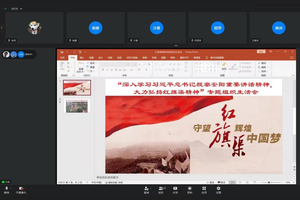 本网讯(通讯员/任彦松)2022年11月13日下午,外国语学院第一教师党支部通过钉钉线上会议召开以“深入学习习近平总书记视察安阳重要讲话精神,大力弘扬红旗渠精神”为主题的专题组织生活会。会议由党支部书记孙莉主持,学院党委书记赵万哲、副书记李爽正以普通党员身份与同志们一起参加会议。