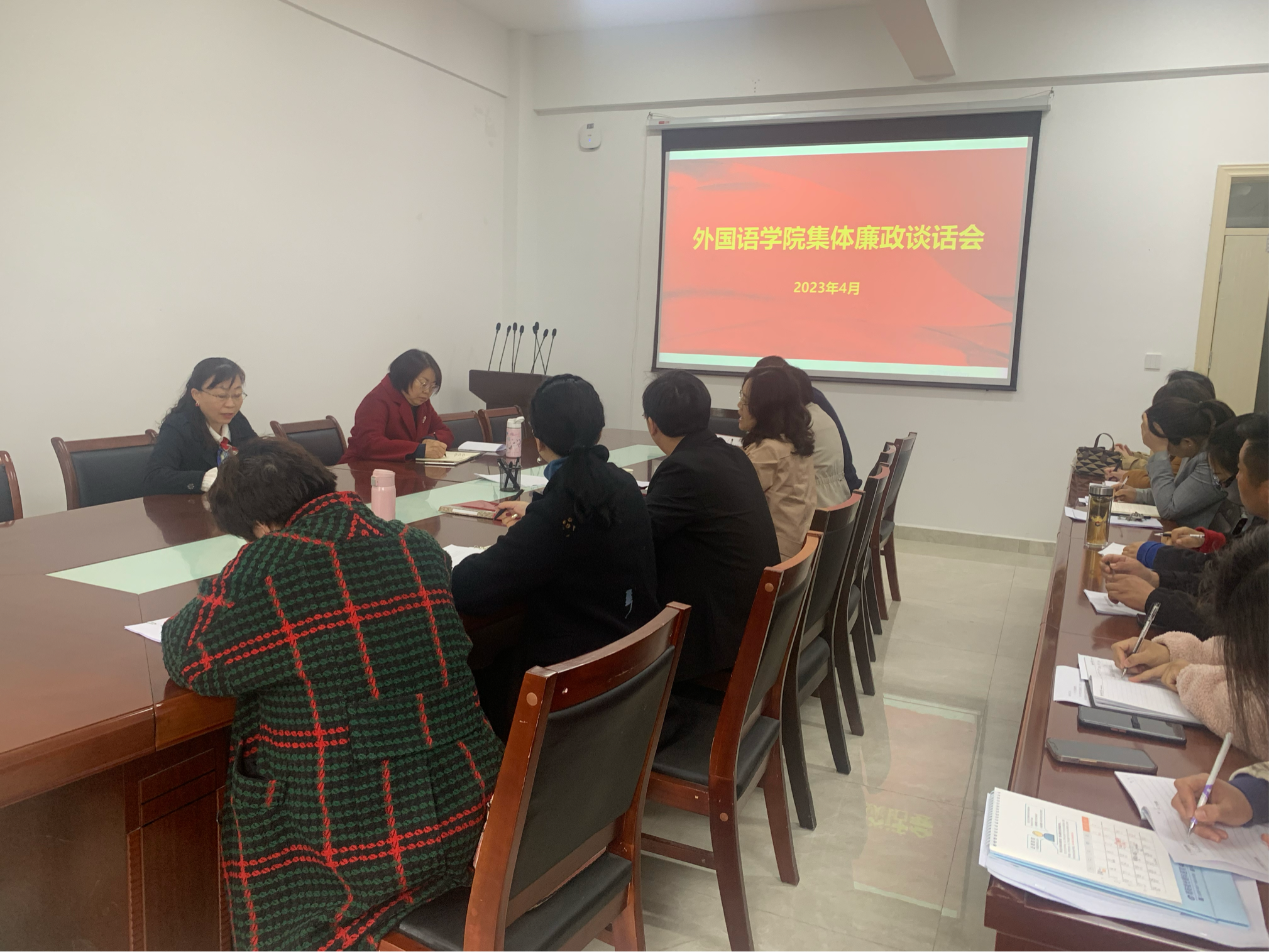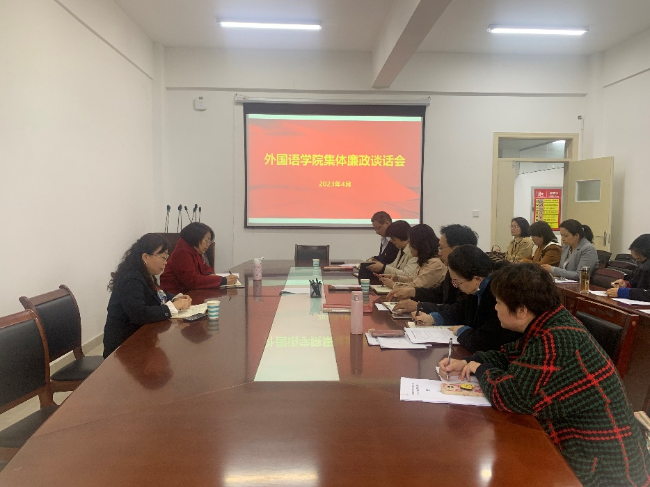 本网讯(学生通讯员/廉用凯)为深入学习贯彻党的二十大精神,推进学校全面从严治党“两个责任”的具体落实,夯实重点领域党风廉政建设政治责任,抓好学院党风廉政建设工作,2023年4月10日,外国语学院在19号教学楼201会议室召开2023年度外国语学院集体廉政谈话会。会议由外国语学院党委书记赵万哲主持,院长海霞及学院科级以上领导干部参加。