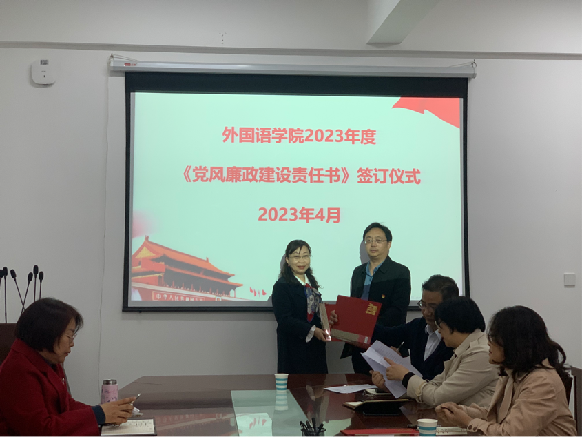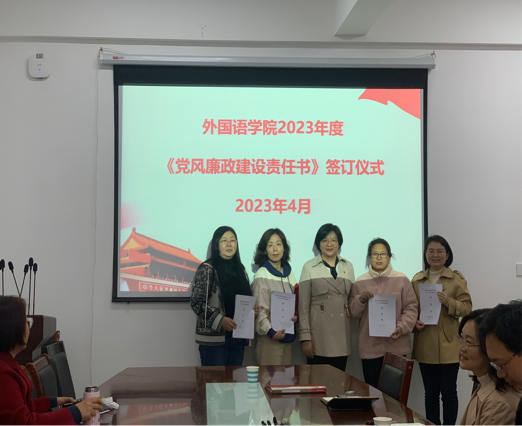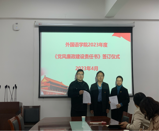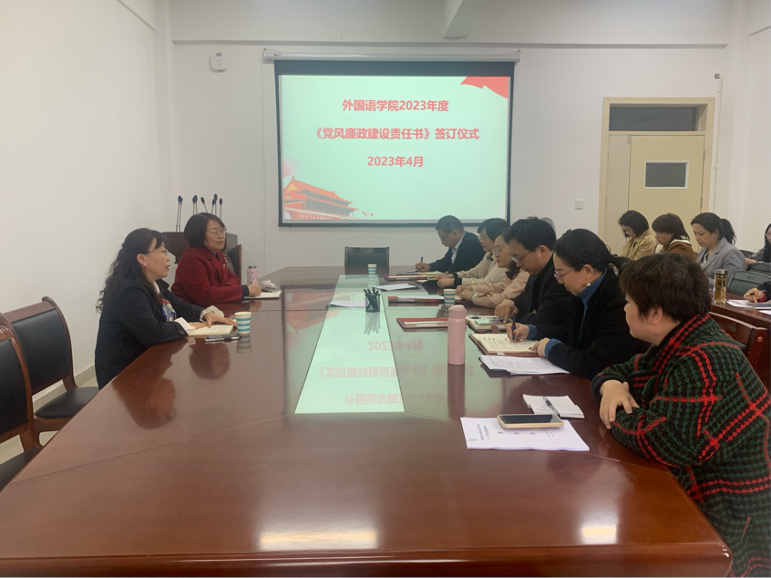 本网讯(特约记者/来蔓均)为深入学习贯彻习近平新时代中国特色社会主义思想和党的二十大精神,切实履行党风廉政建设责任制,2023年4月10日,外国语学院在19教201会议室开展2023年度《党风廉政建设责任书》签订仪式。仪式由学院党委书记赵万哲主持,院长海霞及学院全体副科级以上领导干部参加。