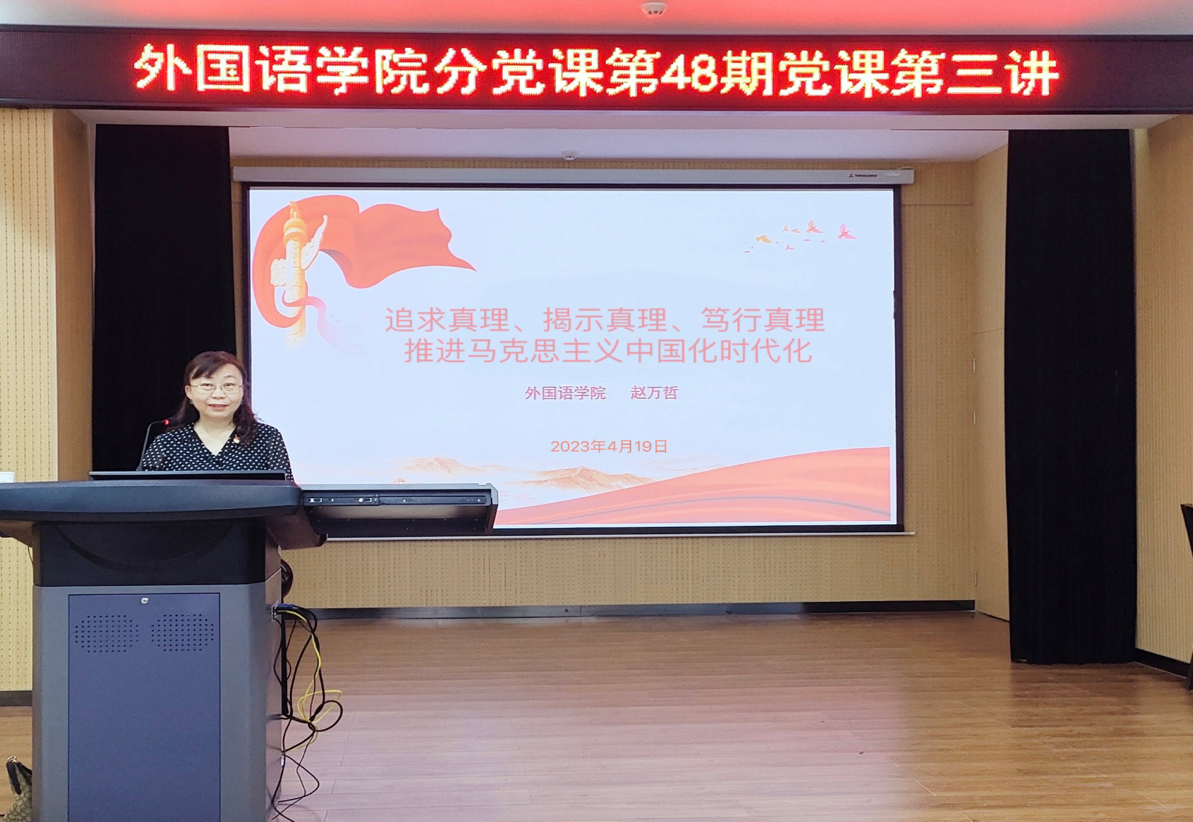 本网讯(通讯员/郑燕茹)为了增强学员们对马克思主义科学性和真理性的深刻认识,不断坚定对中国特色社会主义的信念。外国语学院分党校4月19日在19号楼105教室举办第48期党课培训第三讲——“追求真理、揭示真理、笃行真理,推进马克思主义中国化时代化”,由外国语学院党委书记赵万哲宣讲,外国语学院各党支部委员、学生党建工作站全体人员及第48期入党积极分子积极参加。
