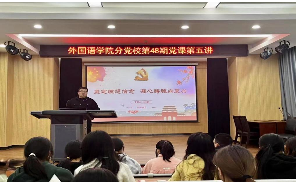 本网讯(学生通讯员/廉用凯)为了让同学们充分学习如何坚定理想信念,2023年4月21日下午,外国语学院分党校在19号教学楼105教室开展了“坚定理想信念,凝心铸魂向复兴”专题党课培训活动,外国语学院第一学生党支部书记孙健担任主讲人,第48期入党积极分子参加。