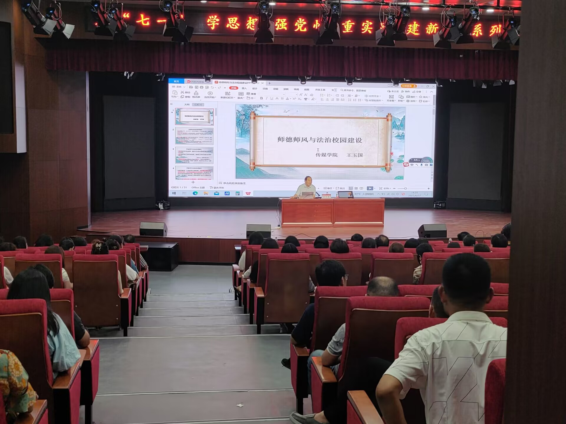 本网讯(通讯员/杜文杰)为深入推动学习贯彻习近平新时代中国特色社会主义思想主题教育走深走实,外国语学院党员领导干部于6月27日下午在21号楼演播厅参加庆“七一”学思想、强党性、重实践、建新功系列主题讲座第三讲《师德师风与法治校园建设》,传媒学院副教授王玉国为本次讲座的主讲人。