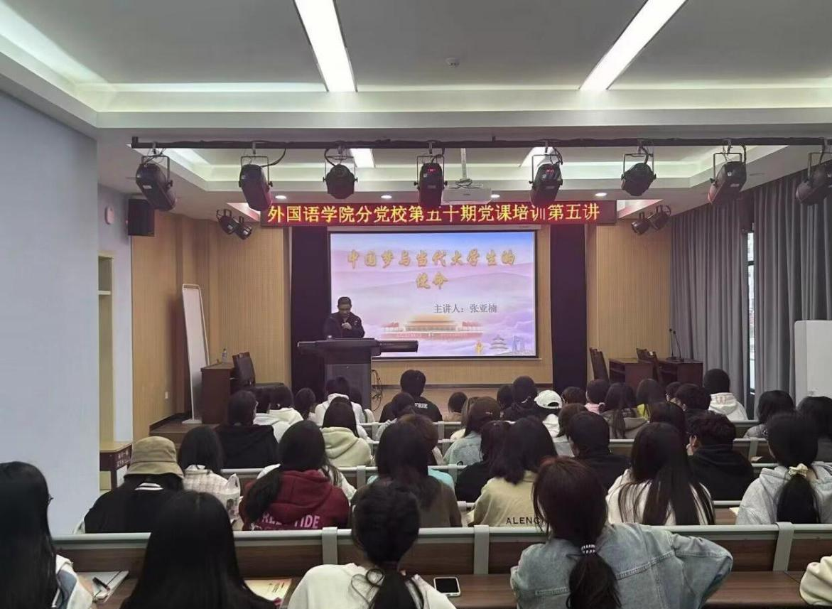 本网讯(通讯员/康馨)为提高当代大学生对自身使命与担当的认识,增强对中国梦的了解,外国语学院分党校于3月29日晚在19教105开展党课培训第五讲《中国梦与当代大学生的使命》,由外国语学院副院长张亚楠主讲,第50期入党积极分子参加。