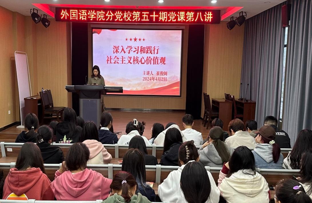 本网讯(通讯员/冯乙朗)为加强学生的思想引领和党性教育,引导学生树立正确的人生观、世界观、价值观,增强党性修养,提高政治觉悟,外国语学院分党校于4月2日在19教105开展第八讲《深入学习和践行社会主义核心价值观》,由外国语学院教务办公室主任崔俊阁主讲,第50期入党积极分子参加。