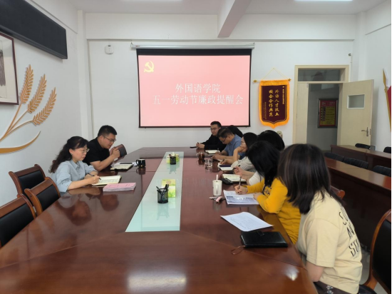 本网讯(记者/王潇菡)4月29日,在五一劳动节来临之际,为进一步强化党风廉政建设,增强全体教职工廉洁自律意识,营造风清气正的节日氛围,外国语学院于19号楼201会议室召开了五一劳动节廉政提醒会,会议由党委书记李新宁主持,学院全体班子成员、党委委员参加了此次会议。