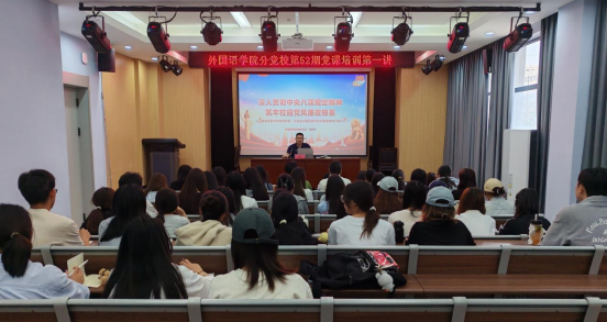 本网讯(通讯员/李雯雯)为培育政治坚定、作风清正的新时代青年,筑牢校园党风廉政根基。外国语学院分党校于5月7日晚在19号教学楼105教室开展第一讲《深入贯彻中央八项规定精神 筑牢校园党风廉政根基》,外国语学院党委书记李新宁主讲,第52期入党积极分子参加。