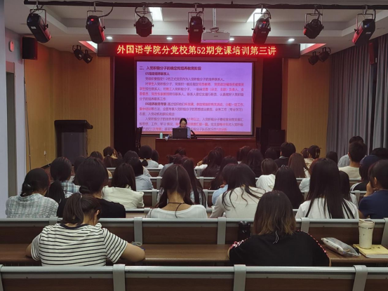 本网讯(通讯员/曾树一)为使入党积极分子熟悉中国共产党发展党员工作流程,提升党员发展质量,筑牢入党根基,外国语学院分党校于5月9日晚在19号教学楼105教室开展第52期党课第三讲,主题为《中国共产党发展党员工作流程介绍》,本次课程由外国语学院党委委员、党政办公室主任来蔓均主讲,第52期入党积极分子参加。