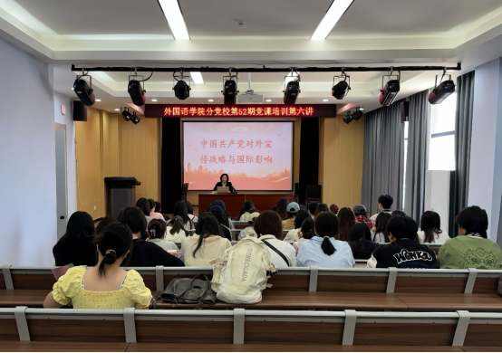 本网讯(通讯员/齐静怡)为了点燃新时代青年在国际传播赛道上的奋进火炬,让中国声音在世界舞台奏响更强劲的时代旋律,外国语学院分党校于5月11日上午在19号教学楼105教室开展党课第六讲《中国共产党对外宣传战略与国际影响》,由外国语学院副院长李秋芳主讲,第52期入党积极分子参加。