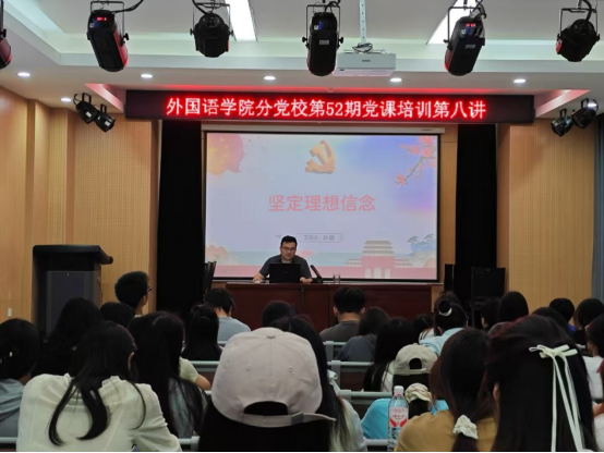本网讯(通讯员/孙鑫畅)为引导入党积极分子树立崇高理想信念,激发家国情怀与奋斗精神,外国语学院分党校于5月12日晚在19号教学楼105教室开展党课第八讲《坚定理想信念》,由外国语学院党委委员、学生工作办公室主任孙健主讲,第52期入党积极分子参加。