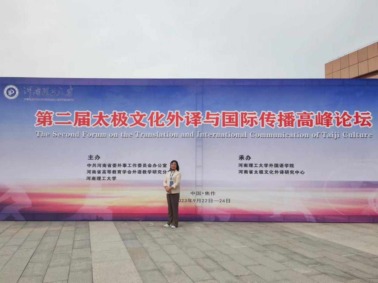 本网讯(通讯员/杜学鑫)2023年9月22日-24日外国语学院教师杜学鑫参加第二届“中华太极文化外译高峰论坛”。论坛由中共河南省委外事工作委员会、河南省高等教育学会外语教学研究分会和河南理工大学主办,中国外文局当代中国与世界研究院党委书记杨平,教育指导委员会副主任委员赵军峰,河南省委外事办二级巡视员焦开举等参加了论坛,专家学者们就如何提升中国特色话语对外译介质量水平和国际传播效果,太极文化外译的现状、存在的问题和解决的办法等问题发表了主题发言。