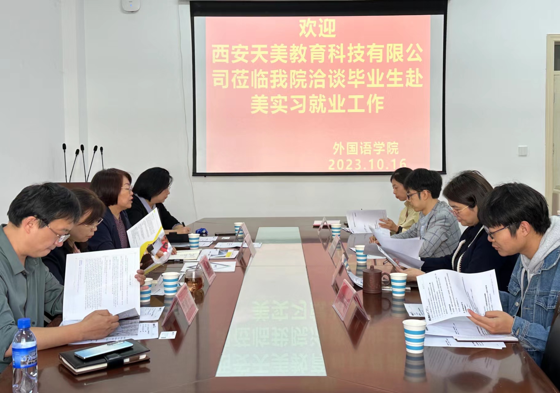 本网讯(通讯员/王玥晴)10月16日,西安天美教育科技有限公司总经理李东伟来我院洽谈毕业生赴美实习就业工作。院长海霞、党委书记赵万哲、副院长李秋芳、副书记李爽正、就业专干及各专业负责人参加会议。