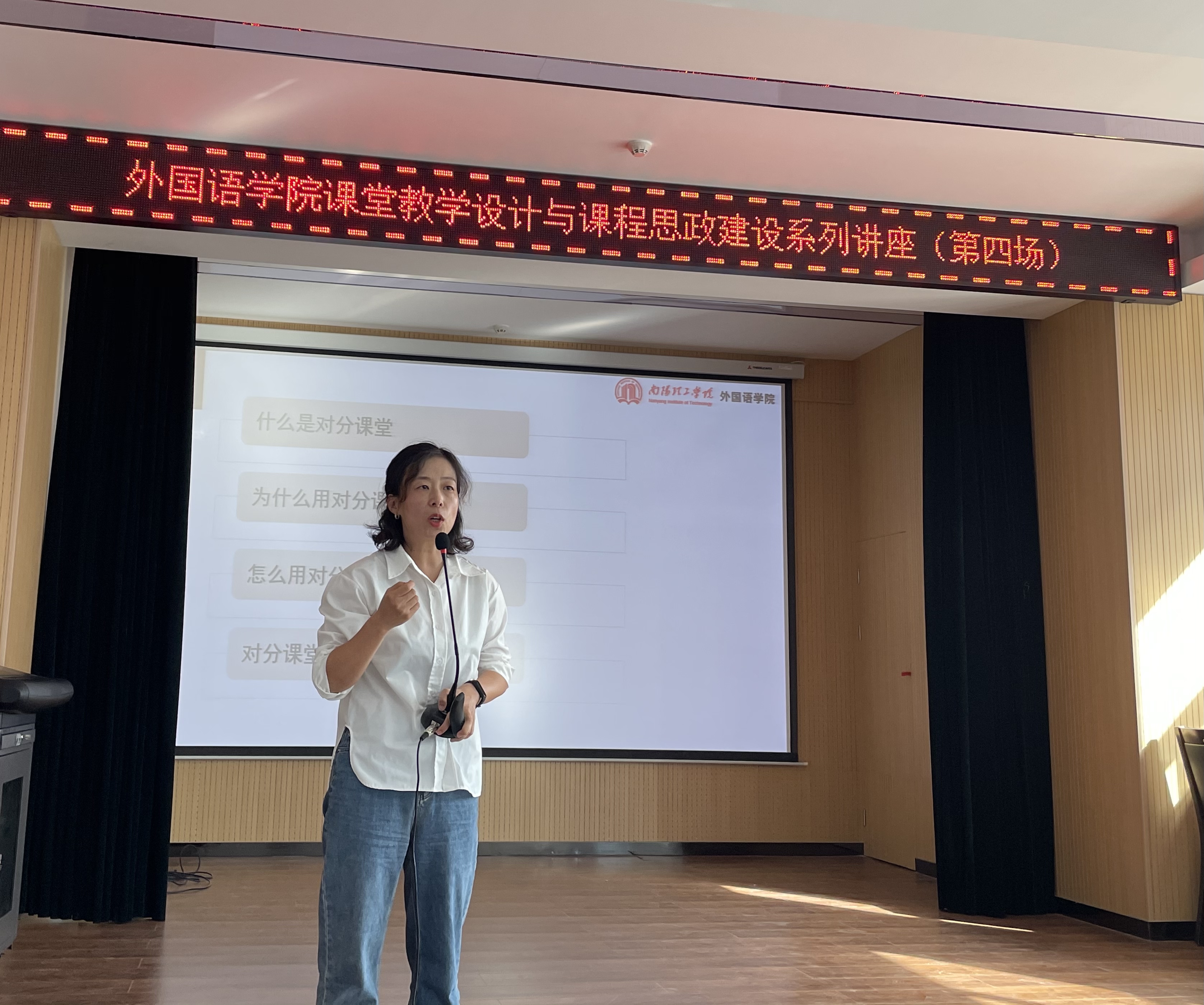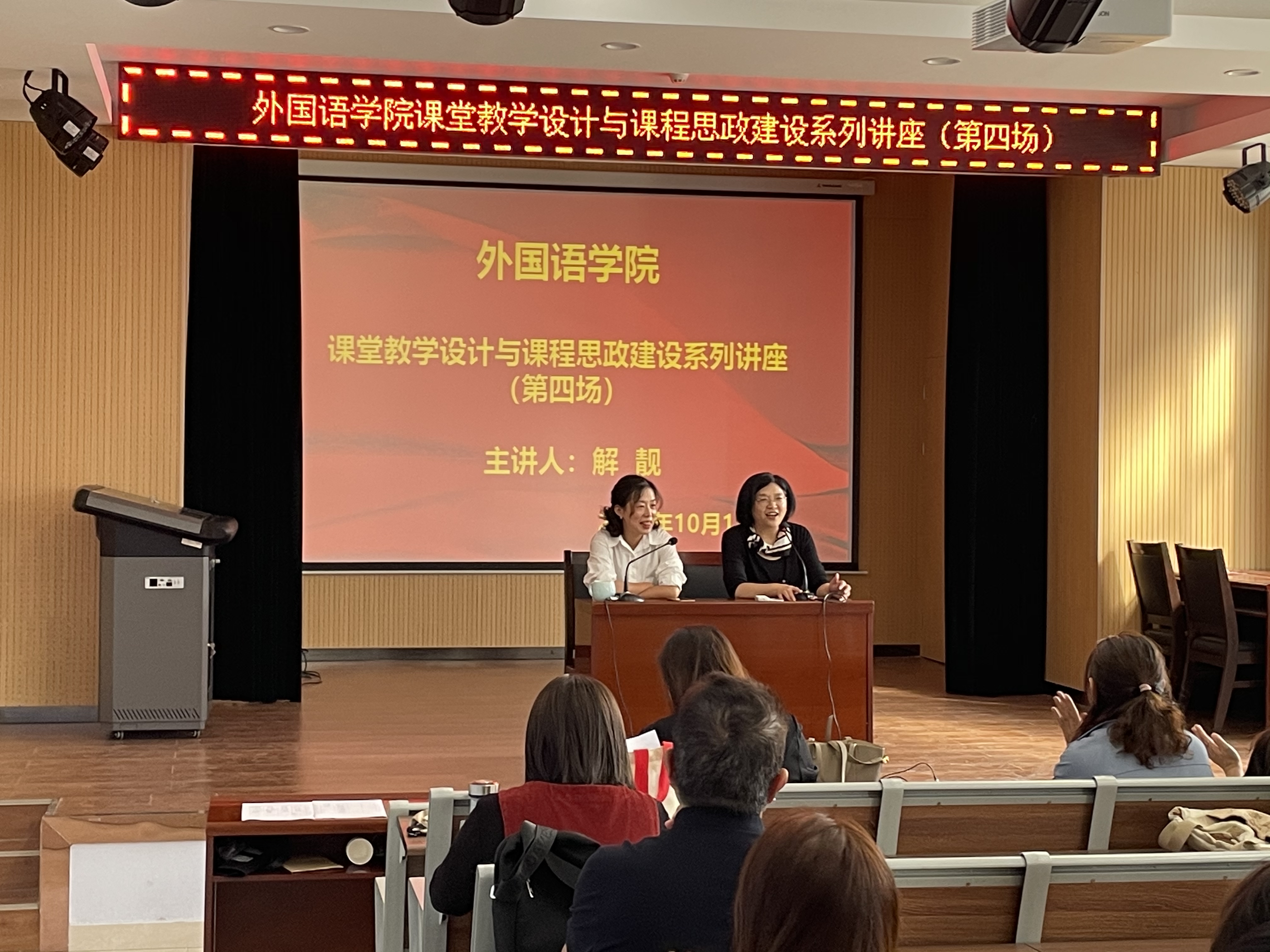 本网讯(作者 滕冰冰)2023年10月17日下午3:00外国语学院课堂教学设计与课程思政建设系列讲座(第四场)——“对分课堂与课程思政在外语教学中的应用”在19-105成功举办。讲座由对分课堂认证教师、我校金牌教发师解靓主讲,外国语学院全体专职教师参加。