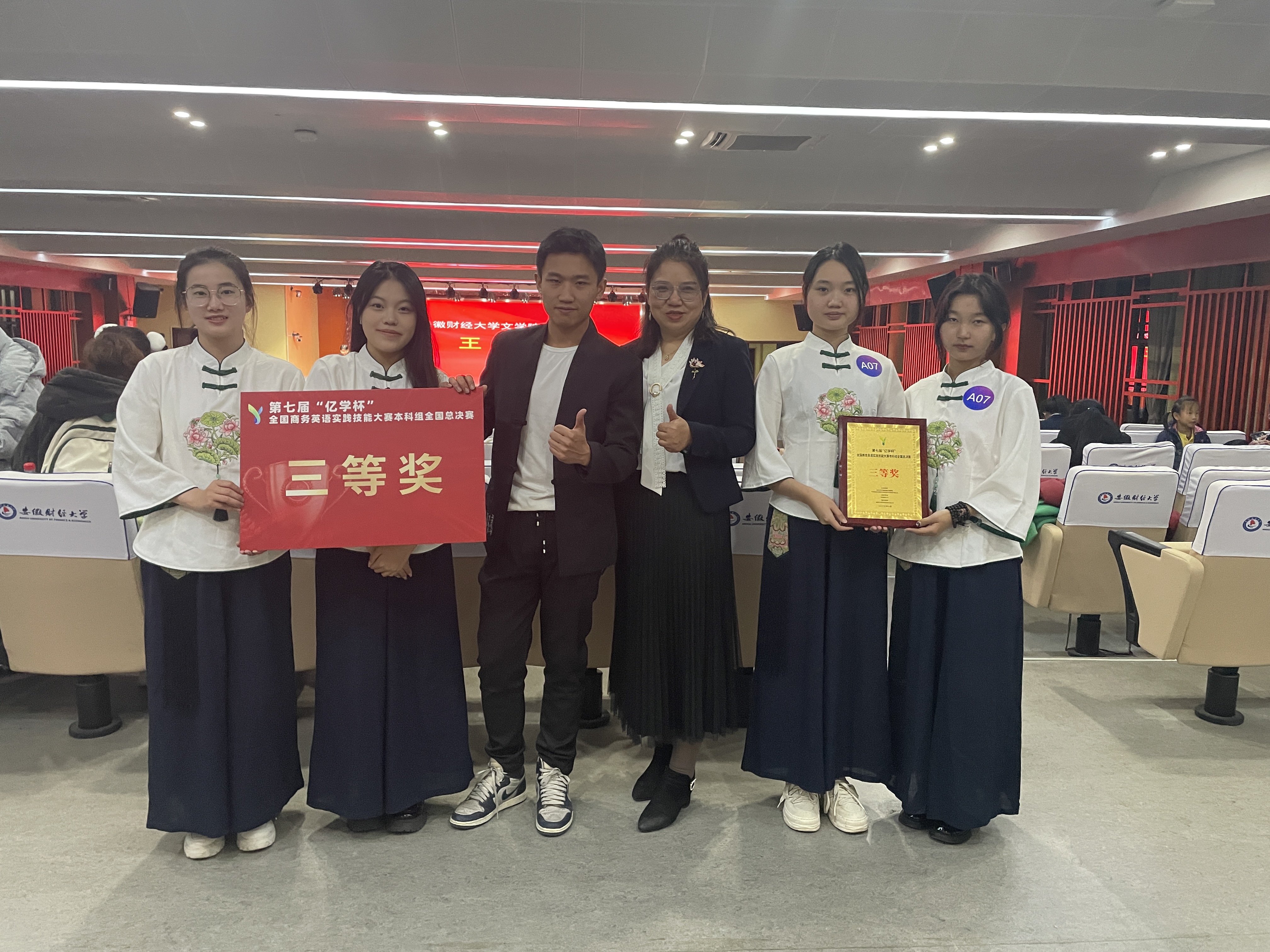 本网讯(通讯员/杨彦丽)2023年11月24-26日,第七届“亿学杯”全国商务英语实践技能大赛本科组全国总决赛在有“珍珠城”美誉之称的淮河流域中心城市蚌埠市的安徽财经大学龙湖校区成功举办,南阳理工学院杨彦丽老师带领陈嘉朋、叶平威、谢婧玲、李超越和岳超英5位同学参加了全国总决赛,并在决赛中荣获三等奖。