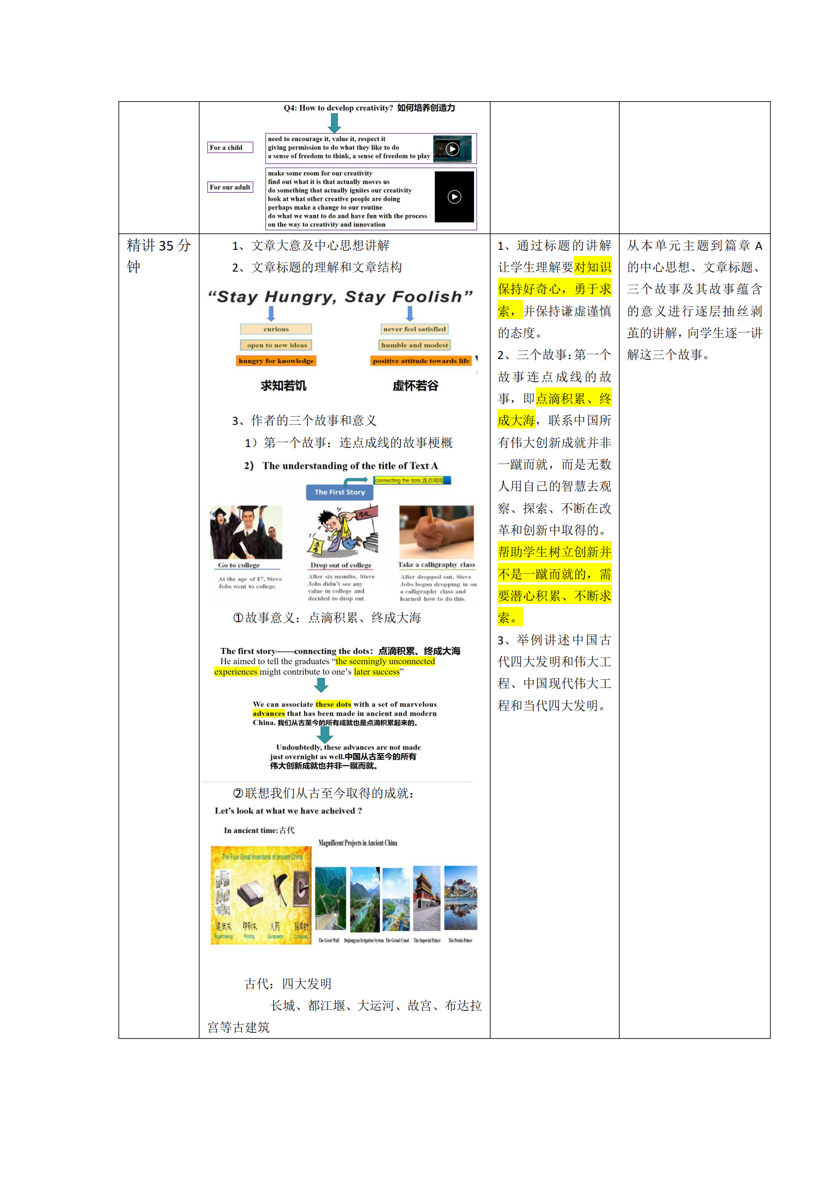 从本单元主题到篇章A的中心思想、文章标题、三个故事及其故事蕴含的意义进行逐层抽丝剥茧的讲解,向学生逐一讲解这三个故事:1、 通过标题的讲解让学生理解要对知识保持好奇心,勇于求索,并保持谦虚谨慎的态度。2、三个故事:第一个故事连点成线的故事,即点滴积累、终成大海,联系中国所有伟大创新成就并非一蹴而就,而是无数人用自己的智慧去观察、探索、不断在改革和创新中取得的。帮助学生树立创新并不是一蹴而就的,需要潜心积累、不断求索。3、举例讲述中国古代四大发明和伟大工程、中国现代伟大工程和当代四大发明。