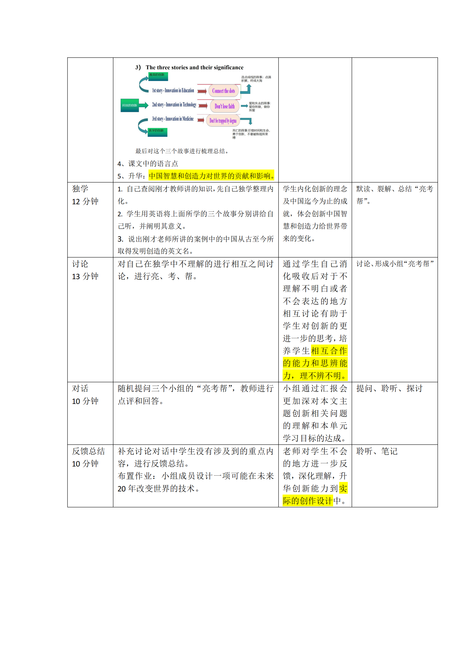 4.学生能够通过独立思考、分析,并通过具体语言活动总结出如何在实际生活学习中培养与运用创新能力,引导学生增强自主创新能力;