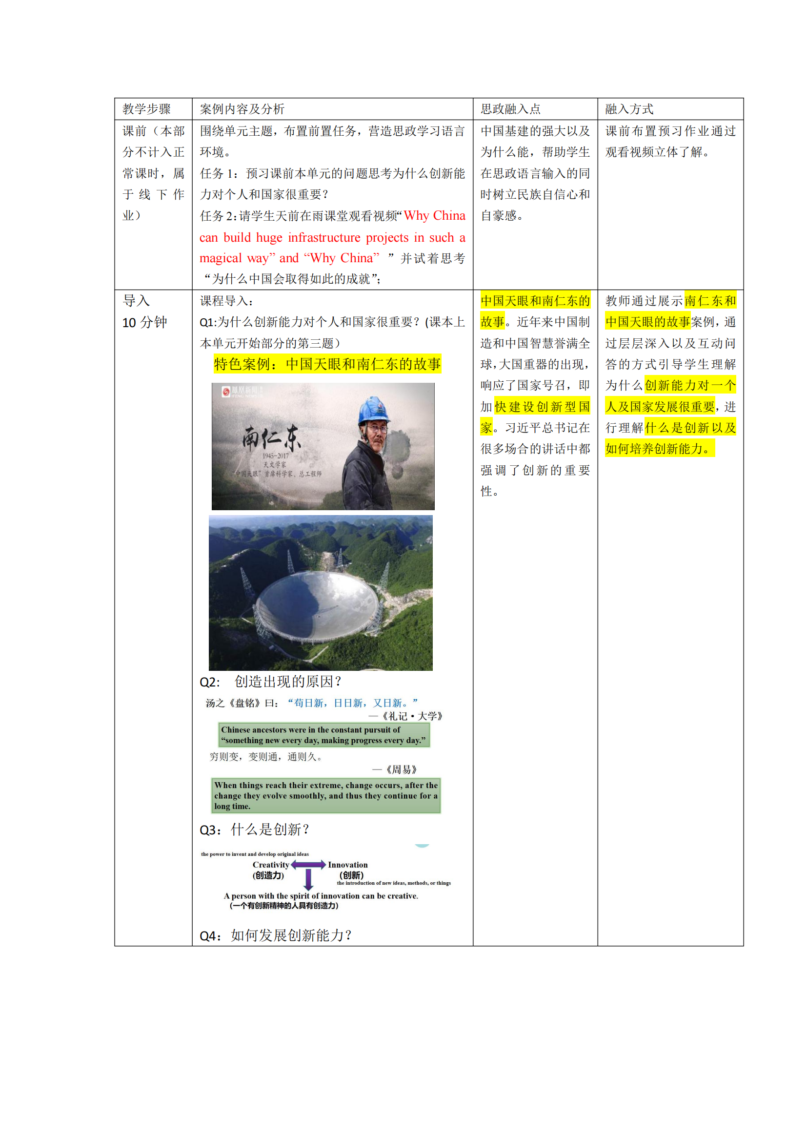 本案例主要以介绍天眼之父南仁东为引,结合文章作者所讲的三个故事为线索及其“创新是基于积累之上”的主旨,进而介绍中国古代及当今科技发明,从传承科技文化的角度使学生认识到科技创新对国家的发展、民族振兴的重要意义,从而有意识地激发学生的创新意识、培养学生创新思维能力。