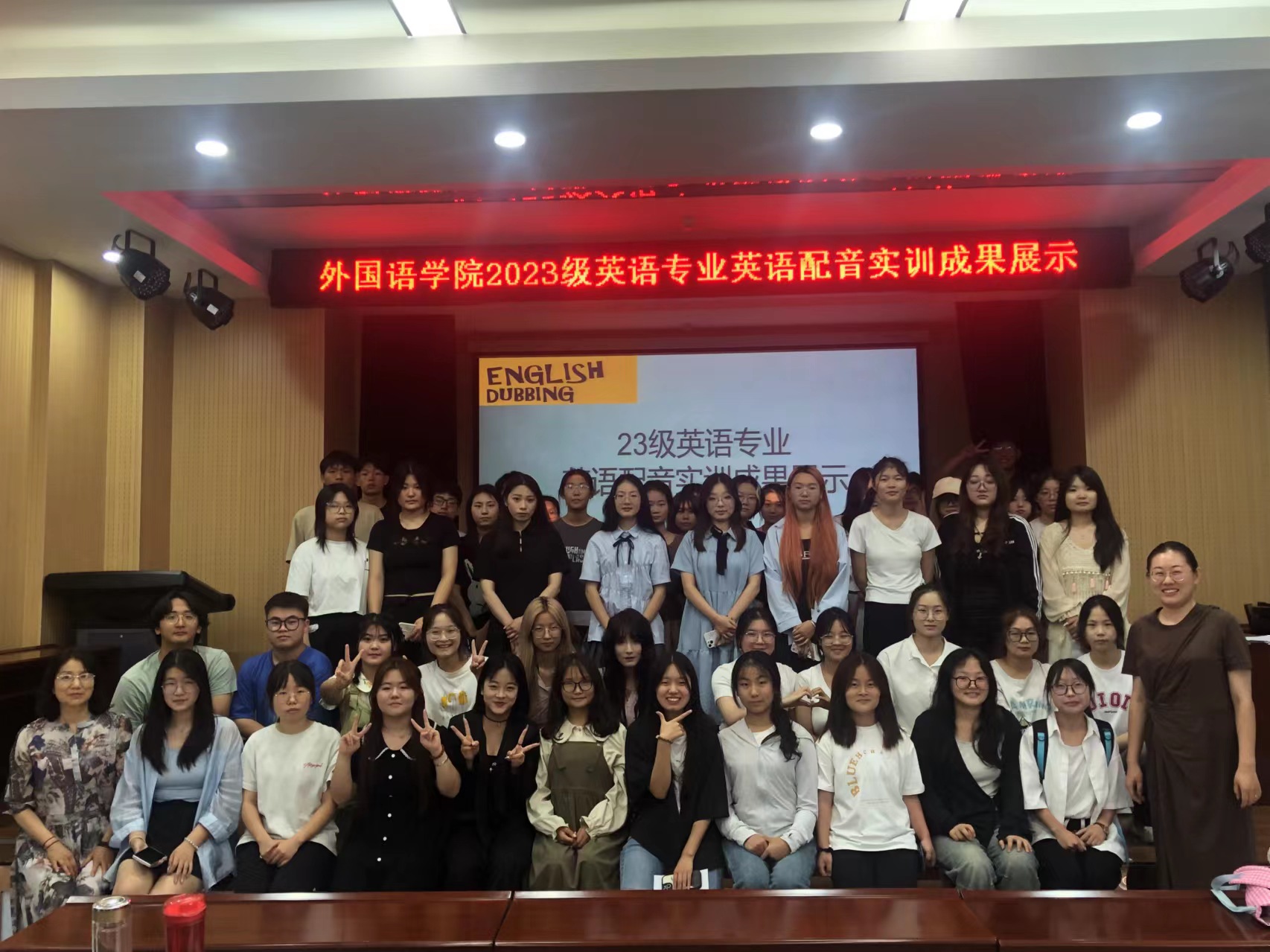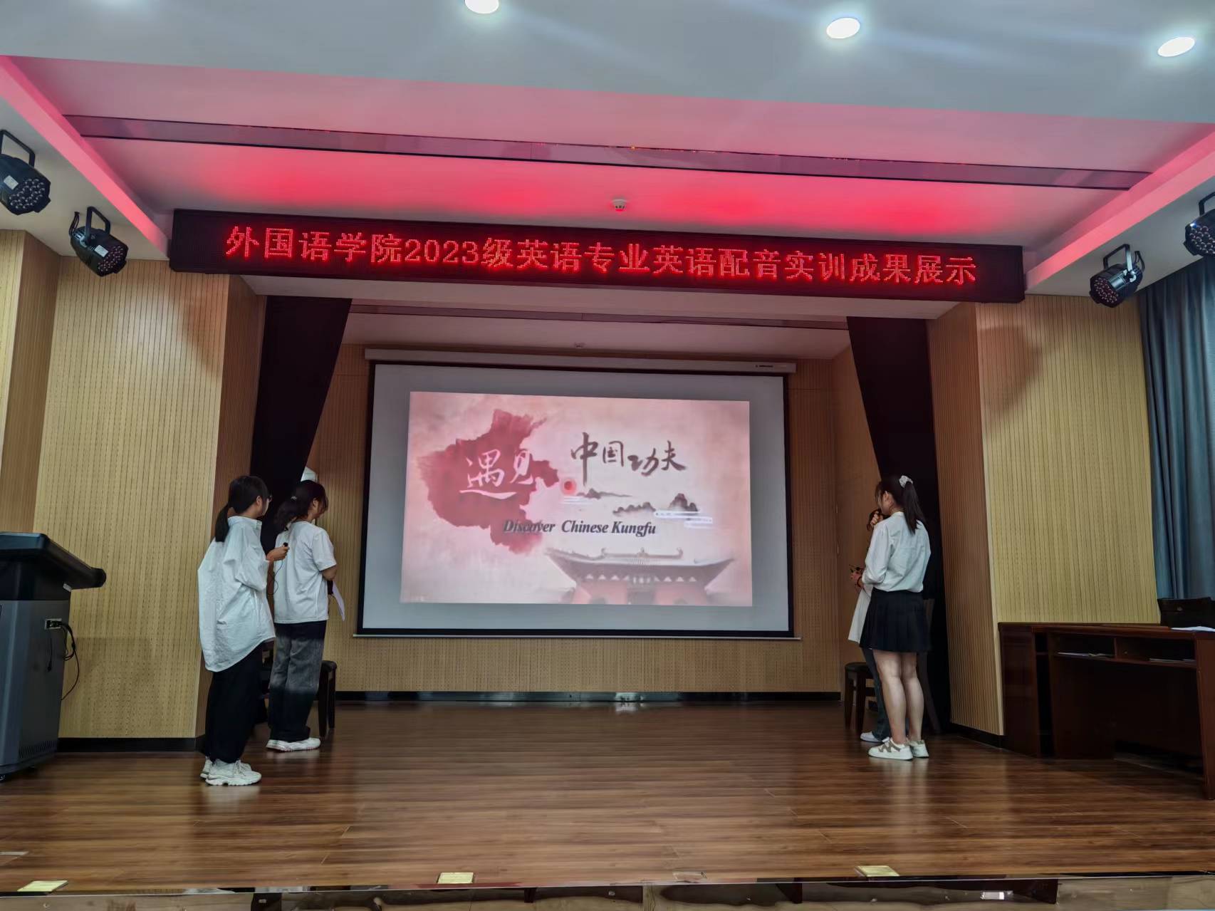 本网讯(通讯员/杜阳)6月21日下午,外国语学院英语专业在19号教学楼105室演播厅成功举办了2023级英语配音实训成果展示活动。本次活动以“河南地域文化”为主题,通过英语配音的形式,展现了河南丰富的历史文化和现代发展,进一步提升了学生的语言运用能力和文化传播意识。指导教师杜阳、夏莲茹参与了此次活动。2024-06-24