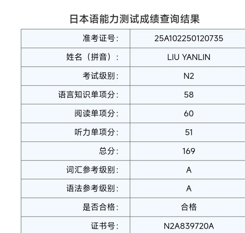 本网讯(通讯员/李银)近日,2025年7月日本语能力测试(JLPT)成绩公布,我校外国语学院2023级日语专业2班刘彦麟同学在N2级别考试中取得169分(满分180分)的优异成绩,其中阅读部分获得满分。