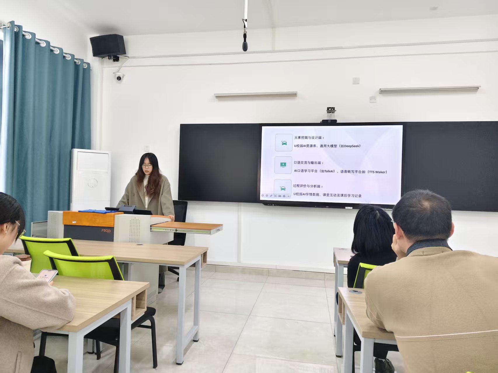 活动中,余小权老师分享了如何利用AI让高年级课程中的抽象思政内容变得生动具体;郭瑜老师探讨了运用AI深度挖掘思政元素的方法;贾琦老师则聚焦AI在在线教学平台中融入思政内容的实践。李银老师基于对我校日语学习者数字素养的调查结果,为AI赋能课程思政教学提供了实证参考。在随后的研讨中,与会教师围绕如何有效利用AI提升课程思政教学效果、提高立德树人质量展开了热烈讨论。