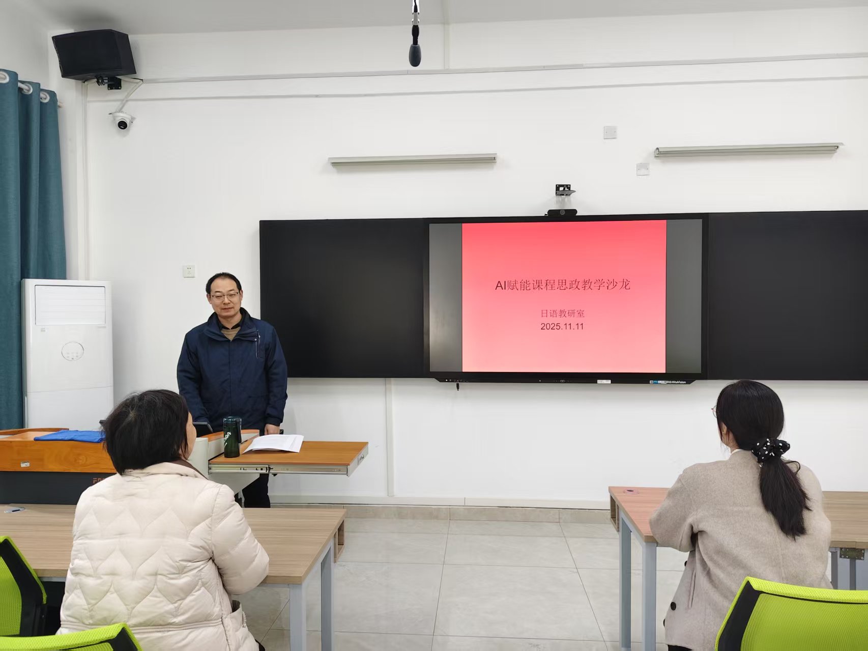 本网讯(通讯员/王玲) 2025年11月11日下午,日语教研室以“AI赋能课程思政”为主题的教学沙龙成功举办。本次活动旨在探索人工智能技术与课程思政教学的深度融合路径,全体日语教师齐聚一堂,共同交流经验、分享智慧。