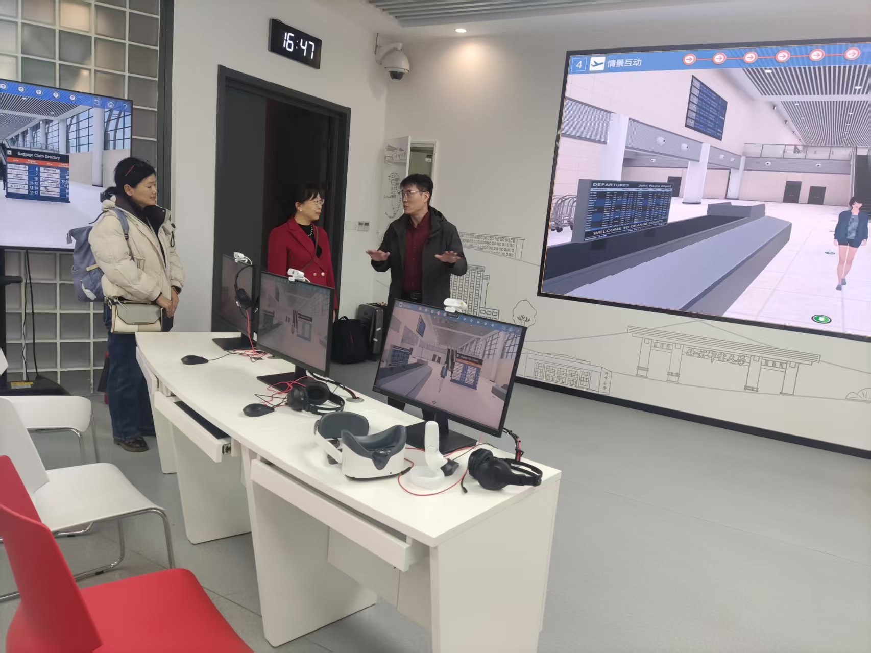 随后,调研团队在北邮相关负责人陪同下,实地参观了语言教学国家级实验教学示范中心,详细考察并体验了沉浸式语言实验室功能与教学成果展示,直观学习了数字化语言教学的先进建设模式。