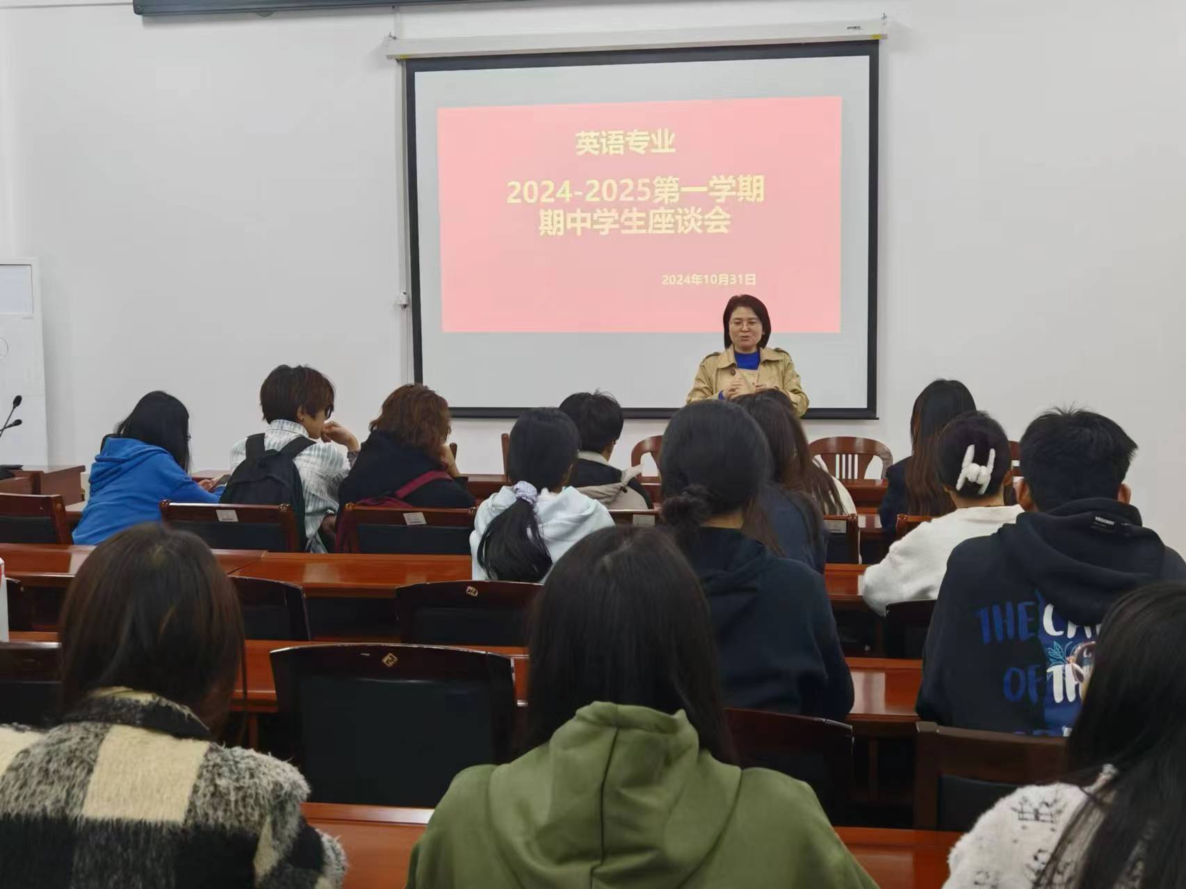 本网讯(通讯员/杜阳)为了全面了解学生在学习过程中的状况与需求,促进教学质量的提升,加强师生间的互动交流,10月31日下午,外国语学院英语专业召开了期中学生座谈会,会议由英语专业负责人王玥晴主持,英语专业各班级学生代表和专业老师出席。
