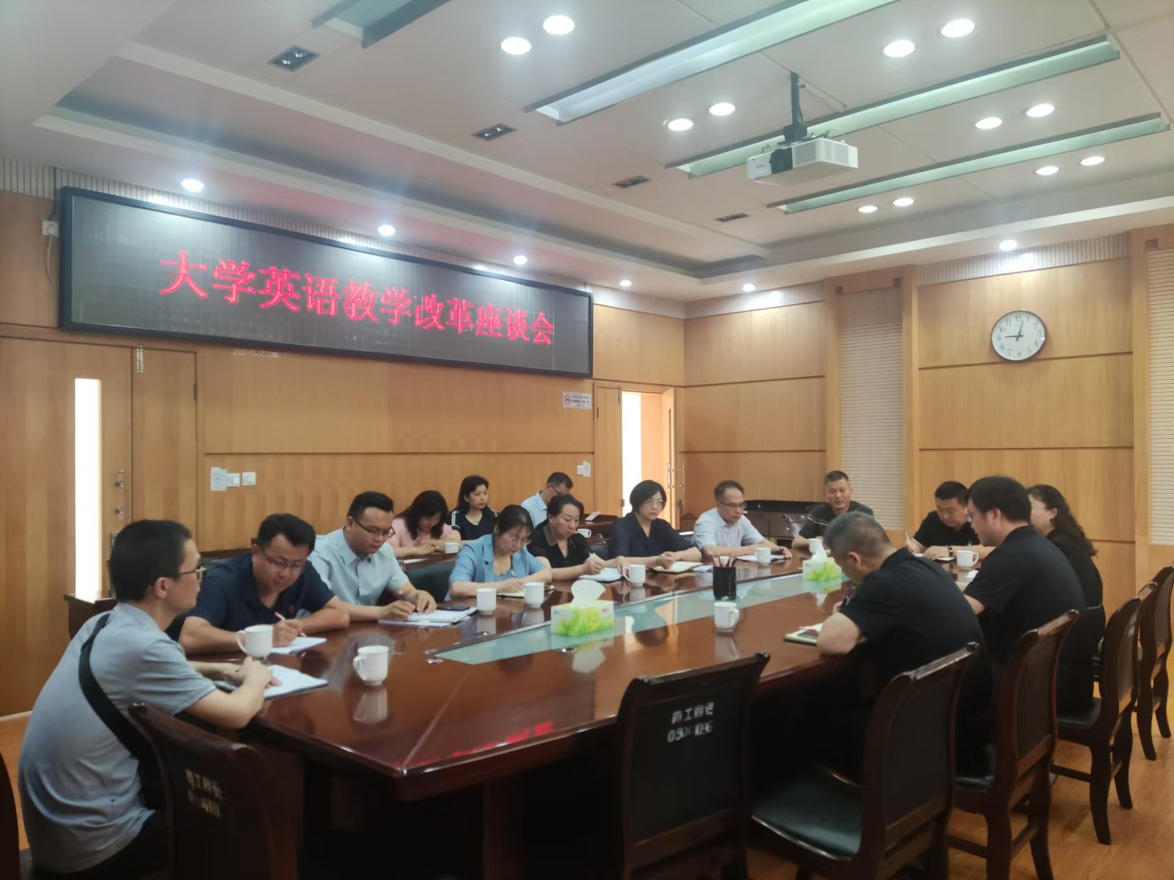 本网讯(特约记者 崔俊阁)5月22日上午,教务处联合外国语学院在中込会馆第二会议室召开大学英语教学改革座谈会,会议由教务处处长吴战勇主持,外国语学院院长赵万哲,教务处副处长刘尚争和13个教学院主管教学工作的副院长参加。