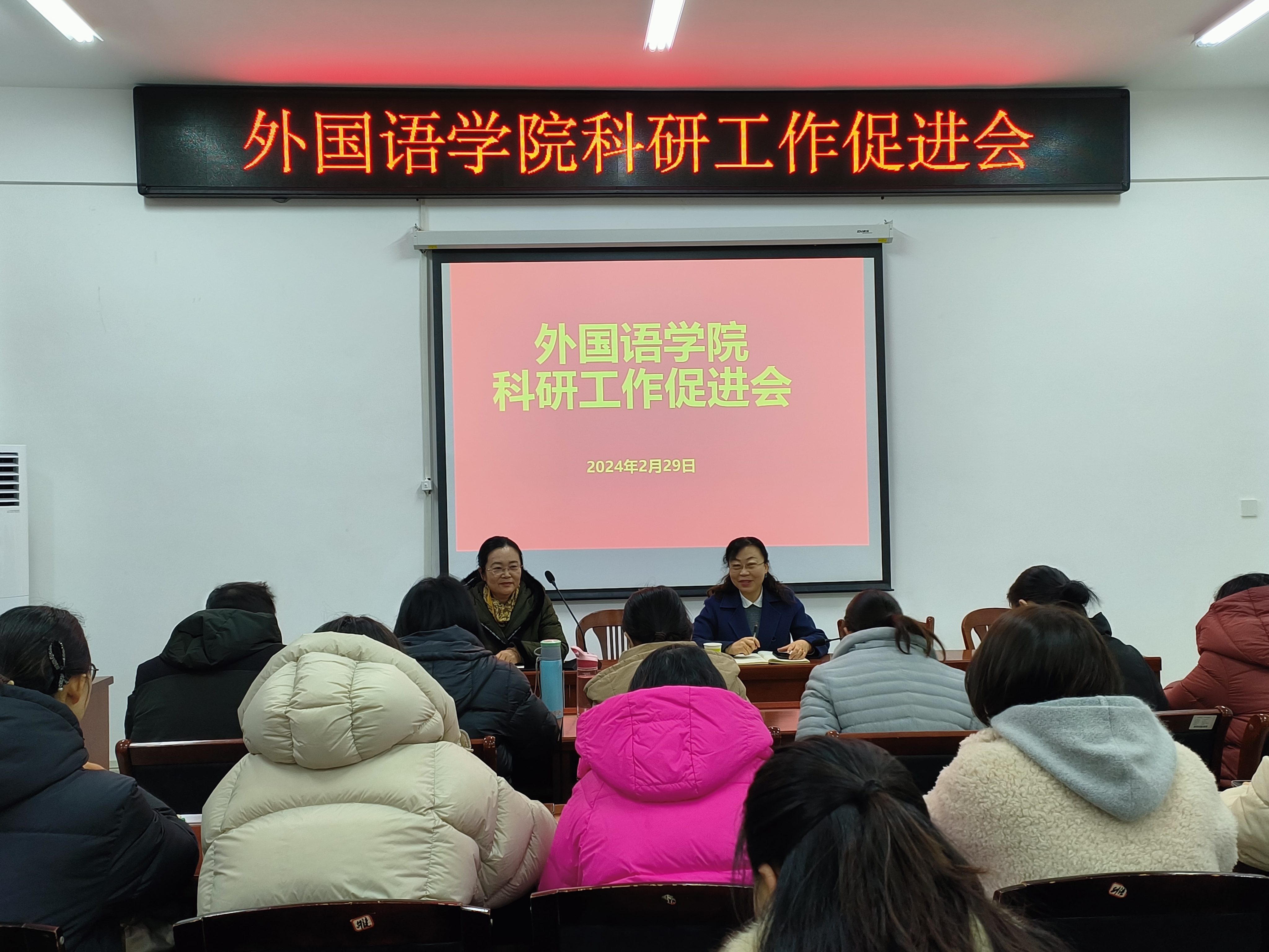 本网讯(通讯员/周小玲)2024年2月29日下午,外国语学院在19202学术报告厅召开春期科研工作促进会。会议由副院长包相玲主持,外国语学院院长赵万哲、省部级在研项目主持人、校级科研平台“中原文化译介与传播研究中心”及“跨文化传播与翻译研究中心”的全体成员参加会议。