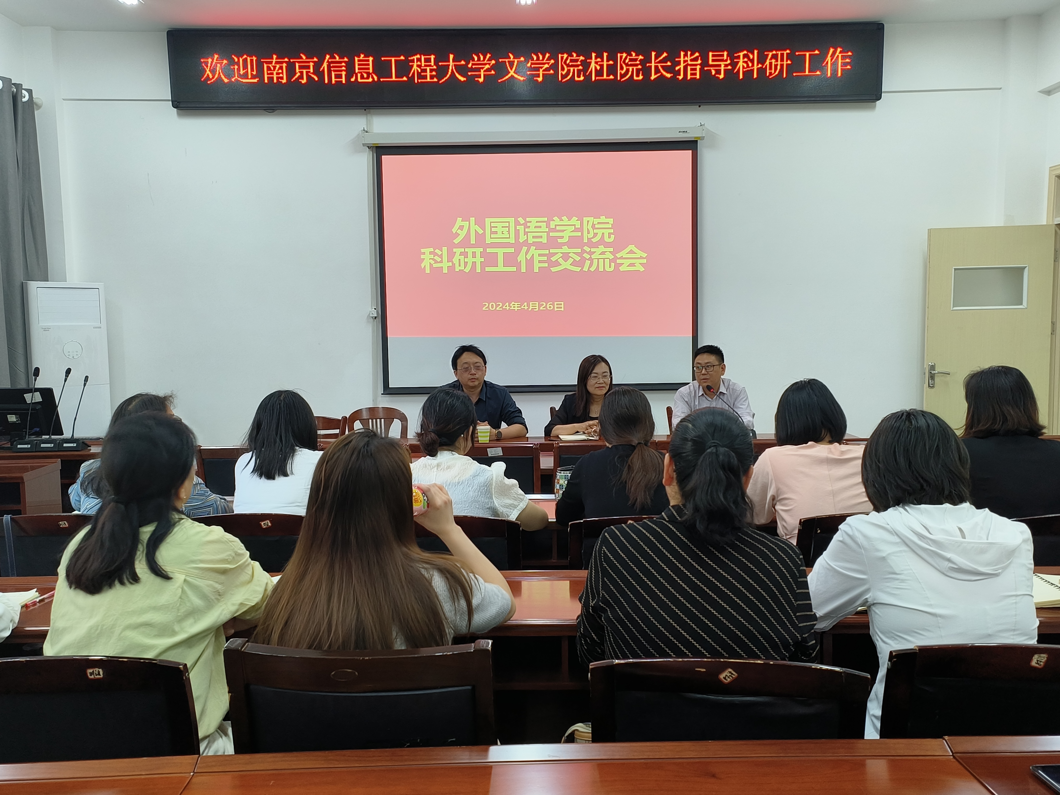 本网讯(通讯员/周小玲)2024年4月26日下午,外国语学院邀请南京信息工程大学文学院副院长杜玉生在19202学术报告厅举行科研工作交流会。会议由副院长包相玲主持,出席本次交流会的成员有外国语学院副书记李爽正、“跨文化传播与翻译研究中心”和“中原文化译介与传播研究中心”的全体成员以及外国语学院全体博士教师。