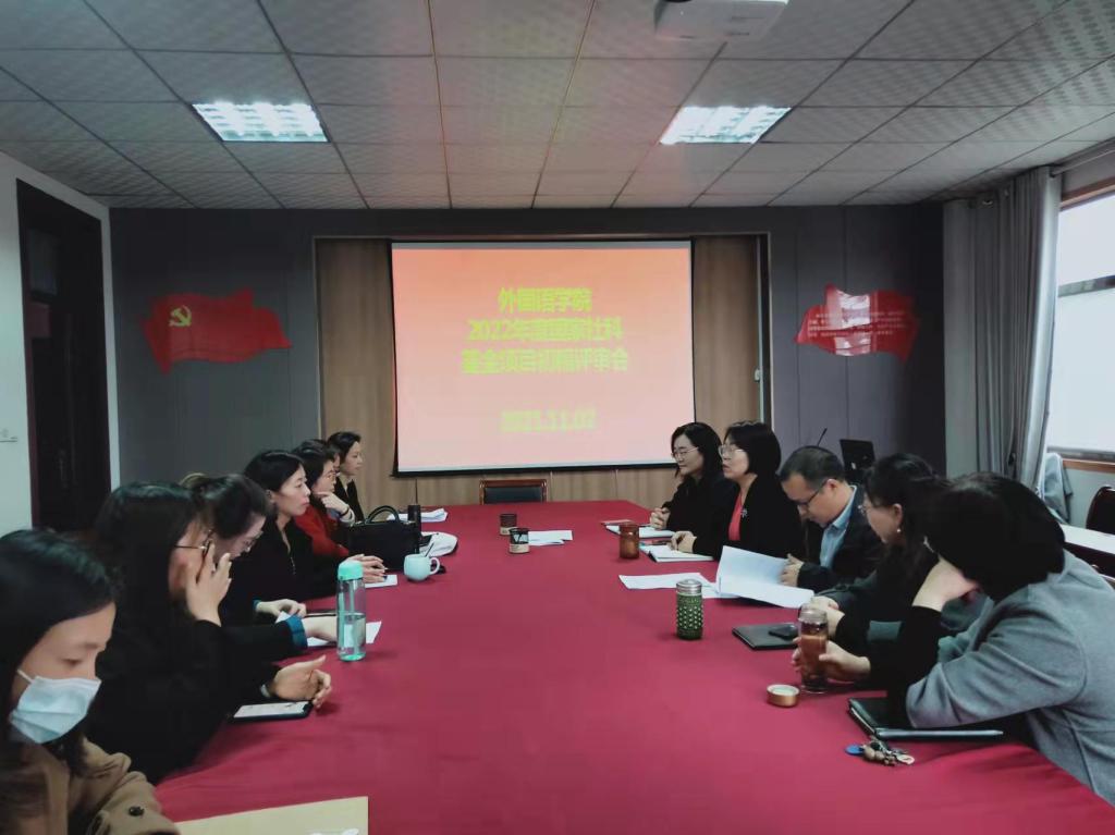 2021年11月2日下午,外国语学院在1234会议室召开2022年度国家社科基金项目初稿评审会议。会议由包相玲副院长主持,外国语学院学术委员会全体成员参加会议,同时特邀范蠡商学院朱九龙教授参加此次评审。
