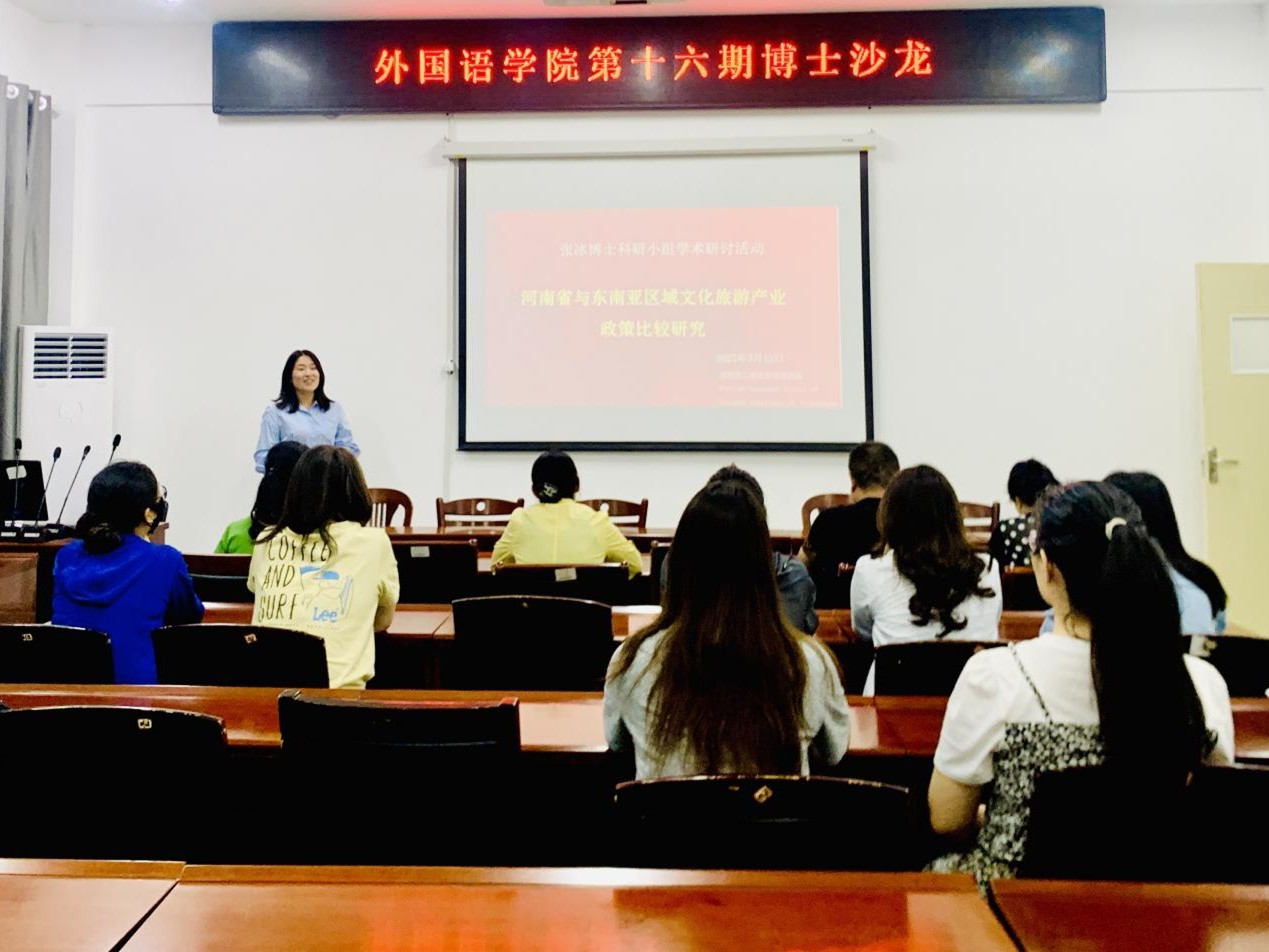 本网讯(通讯员/滕冰冰)5月13日下午,外国语学院如期举办第十六期主题为“河南省与东南亚区域文化旅游产业政策比较研究”的博士沙龙活动,主讲人为学院张冰博士。广大师生积极参与,现场学术氛围浓厚。